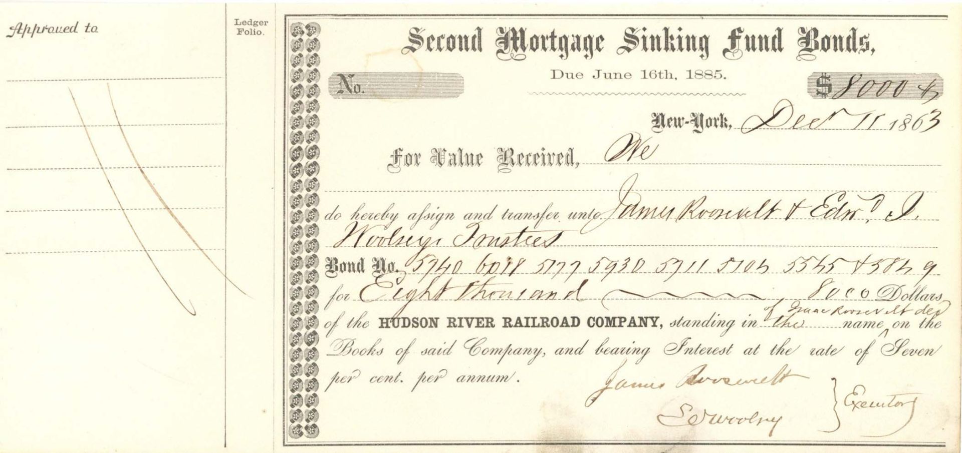 Hudson River Railroad Co. signed by James Roosevelt I - 1863 dated $8,000 Bond