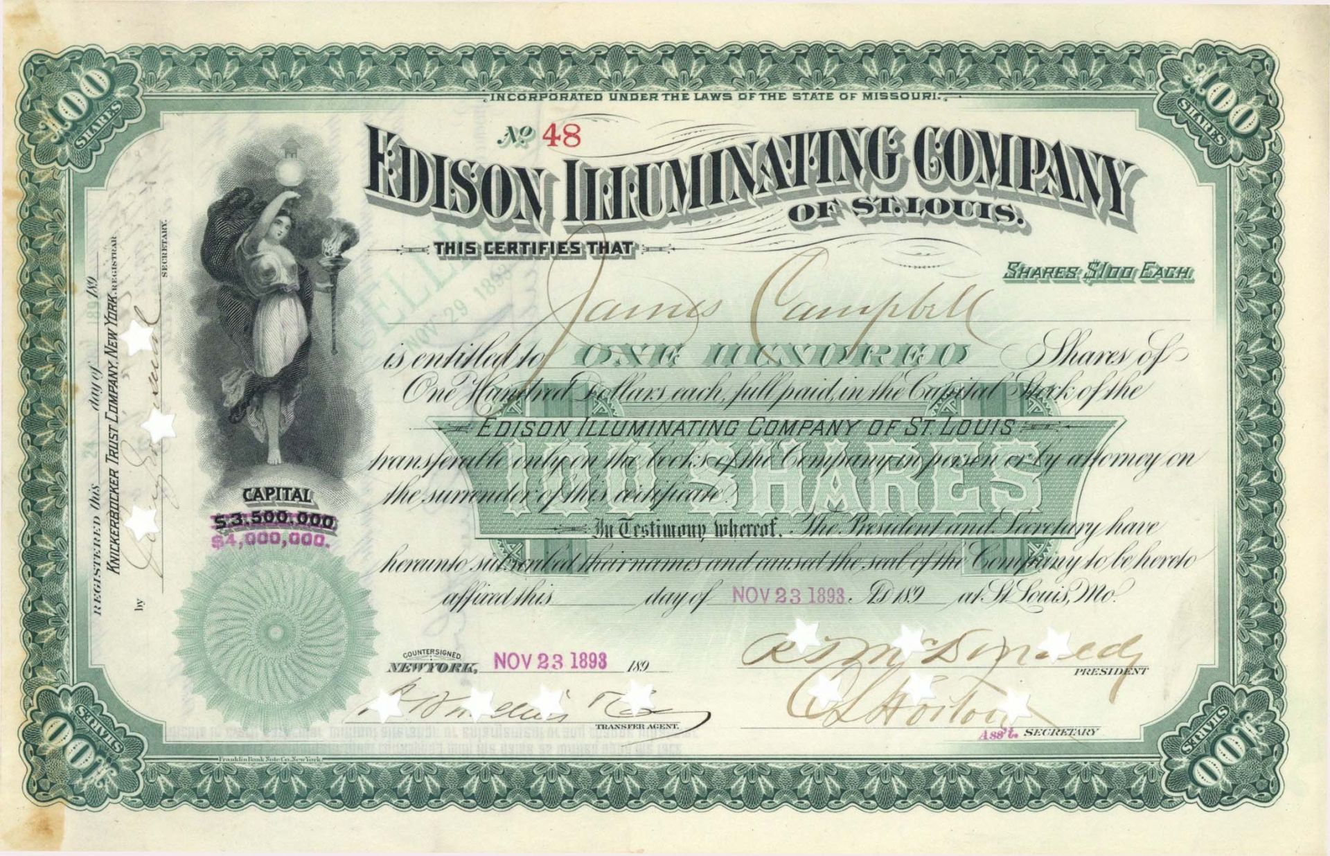 Edison Illuminating Co. of St. Louis - 1893 or 1894 dated Stock Certificate