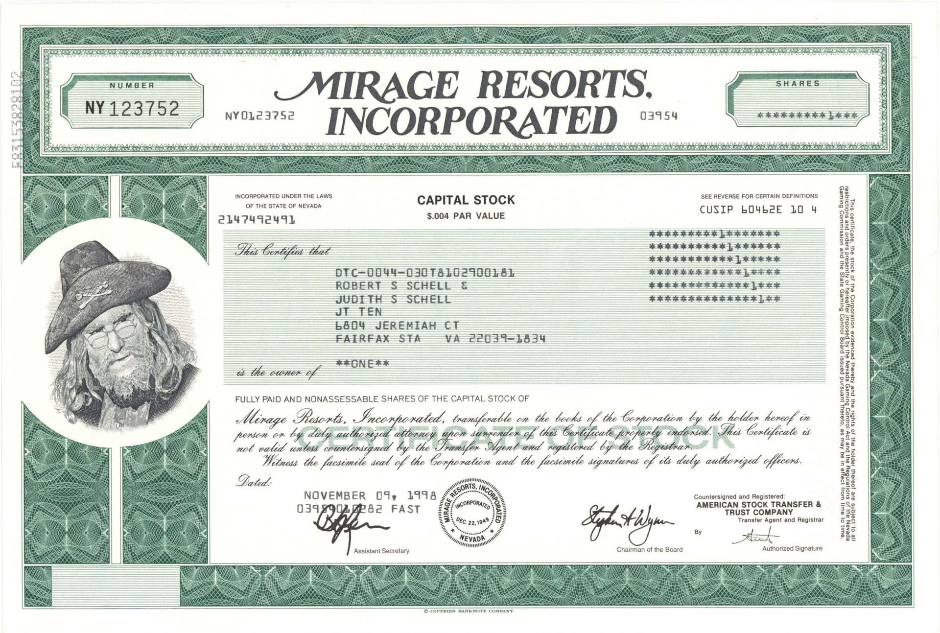 Mirage Resorts Incorp. - 1998 dated Stock Certificate