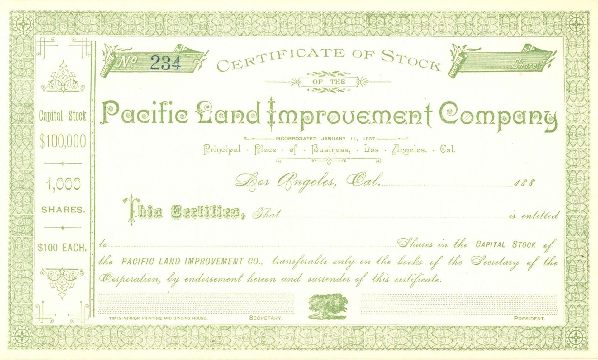 Pacific Land Improvement Co. - circa 1880's Unissued Los Angeles, California Stock Certificate - Part of the Atchison, Topeka and Santa Fe Railroad System