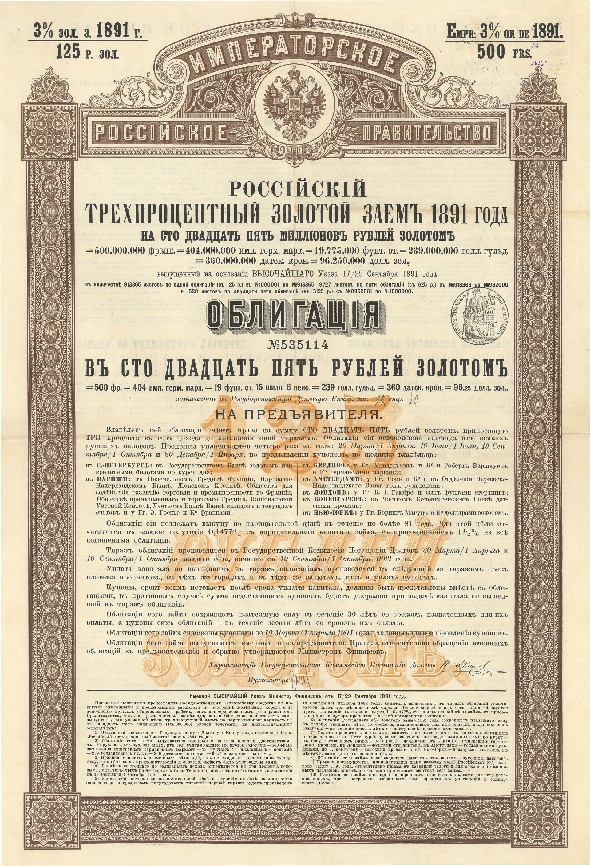 Imperial Government of Russia, 3% 1891 Gold Bond (Uncanceled) - Under Alexander III Reign