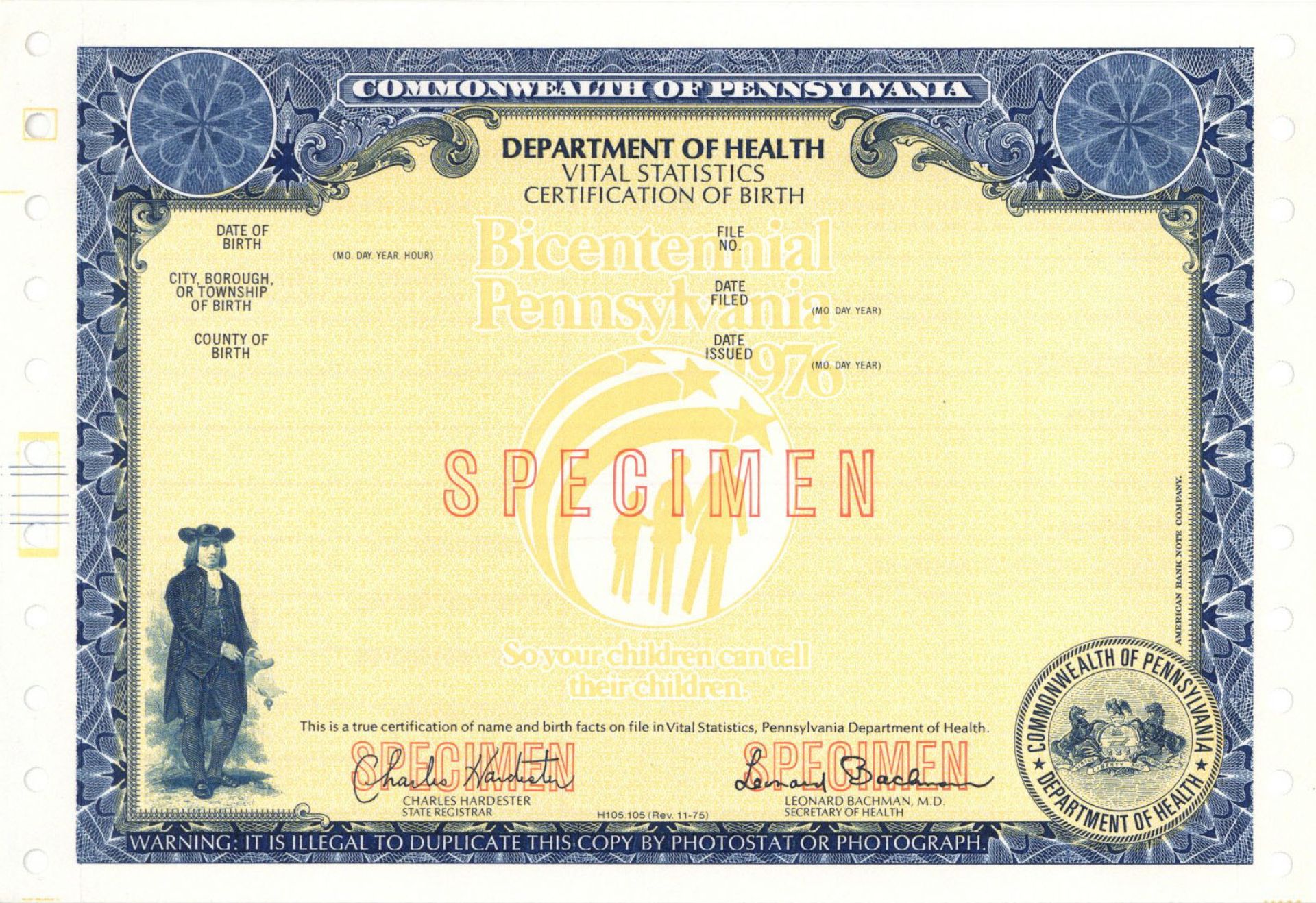 Department of Health Vital Statistics Certificate of Birth - Specimen
