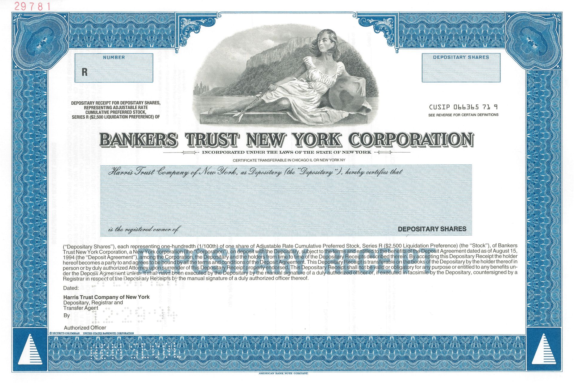 Inv# SE3510 Specimen StockSpecimen Depositary Receipt printed by American Bank Note Company. Bankers Trust New York Corporation was a prominent American financial institution with a rich and evolving history. Founded in 1903 as a service institution for banks, it initially specialized in providing trust services to clients of commercial banks. When the Federal Reserve System's formation in 1914 allowed commercial banks to offer such services directly, Bankers Trust adapted by transitioning into a commercial bank itself. Throughout the 20th century, Bankers Trust underwent significant transformations, including strategic mergers and acquisitions that expanded its retail and wholesale operations, and later, a notable shift towards investment banking, particularly in the innovative field of derivative securities, where it achieved a dominant position.