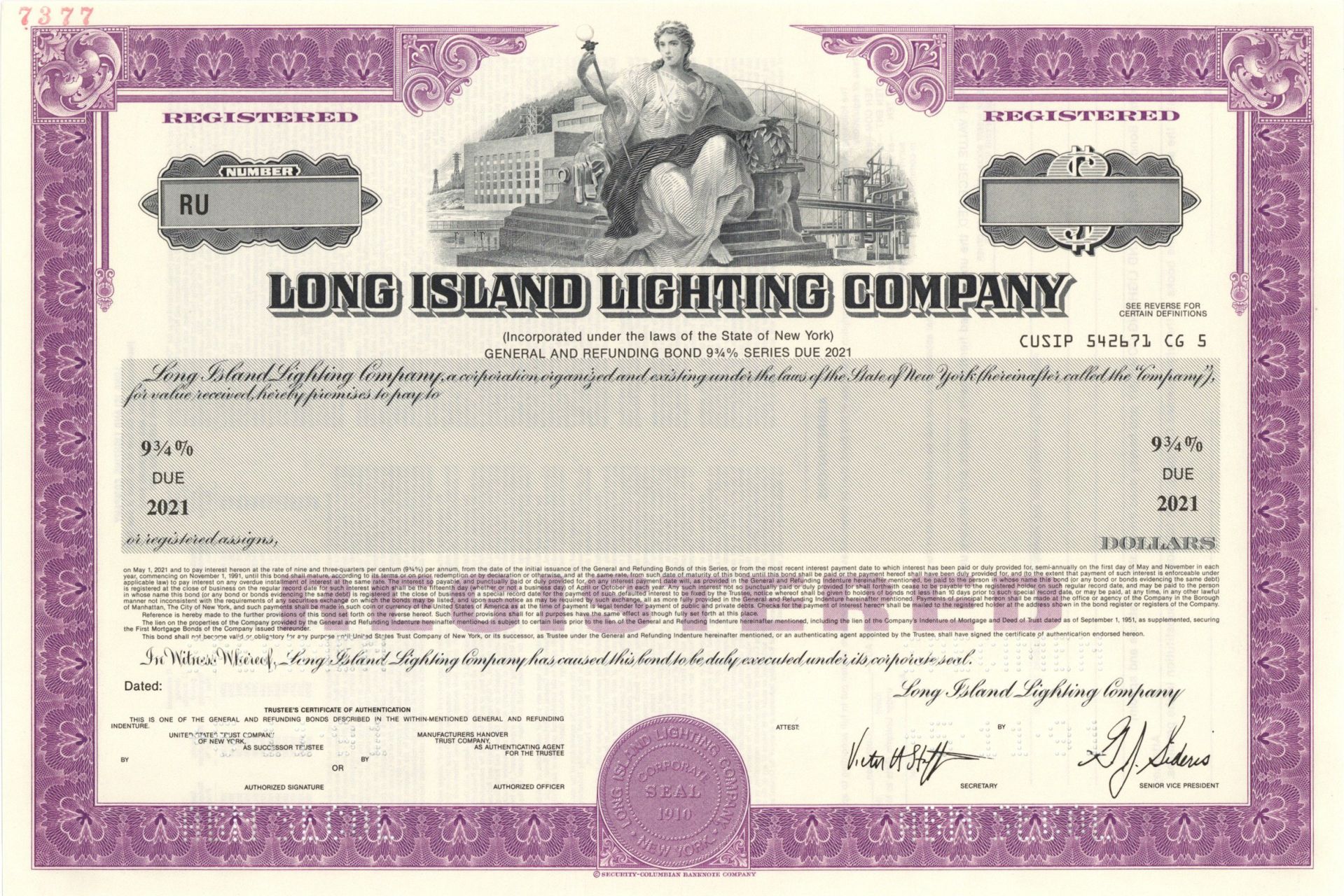 Long Island Lighting Co. - Specimen Bond - Available in Purple, Yellow, Burgundy or Aqua - Please Specify Color
