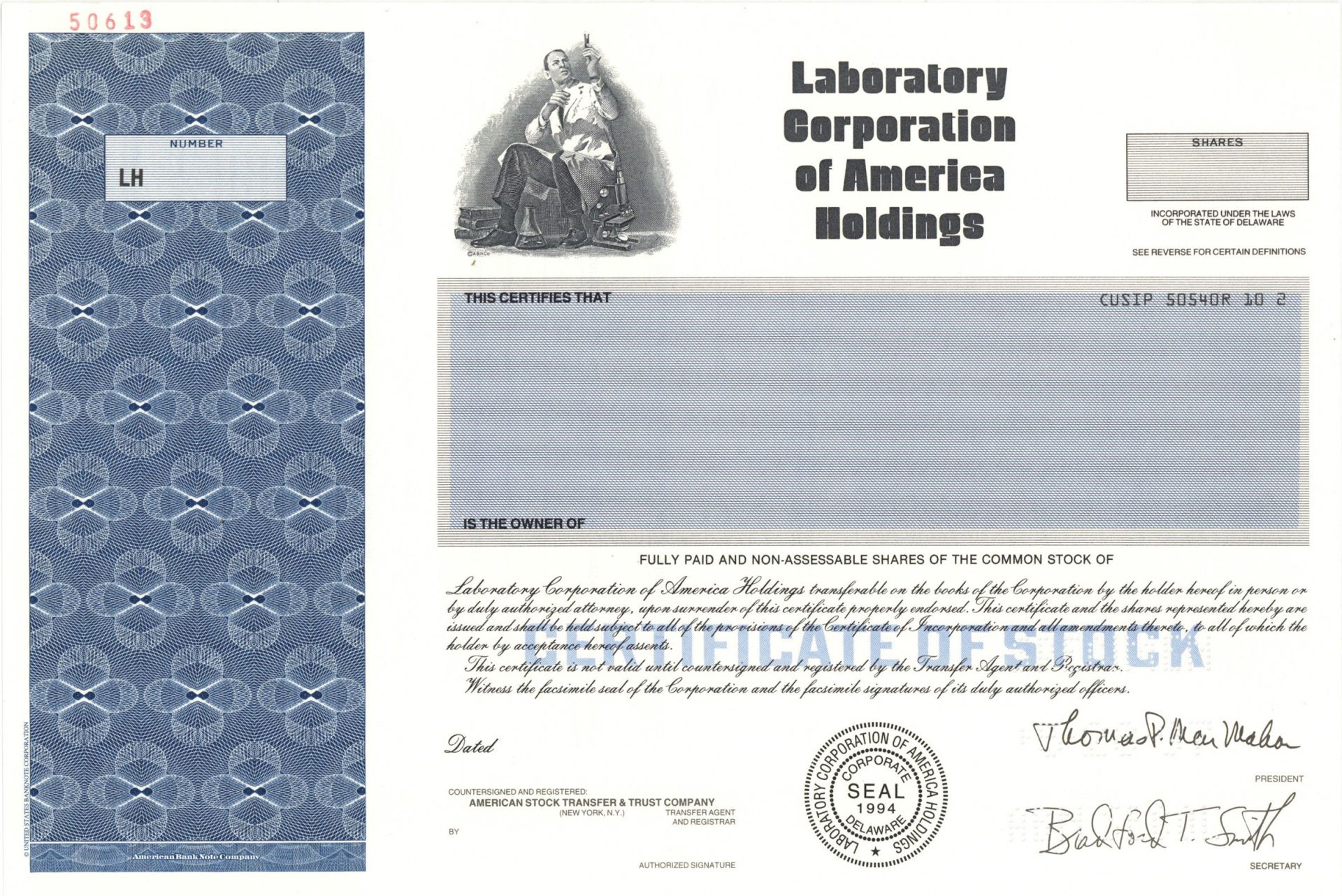 Inv# SE3878 Specimen StockSpecimen Stock printed by American Bank Note Company. Incorporated in 1994. Laboratory Corporation of America Holdings, commonly known as Labcorp, is a major American healthcare company based in Burlington, North Carolina. It operates one of the world's largest clinical laboratory networks, which includes 36 primary laboratories across the United States. The company was formerly known as Roche BioMedical until its merger with National Health Laboratory in 1995. Labcorp's largest volume of specialty testing is conducted at its Center for Esoteric Testing in Burlington, where the company's headquarters are located. As of 2018, Labcorp processes approximately 2.5 million lab tests each week.