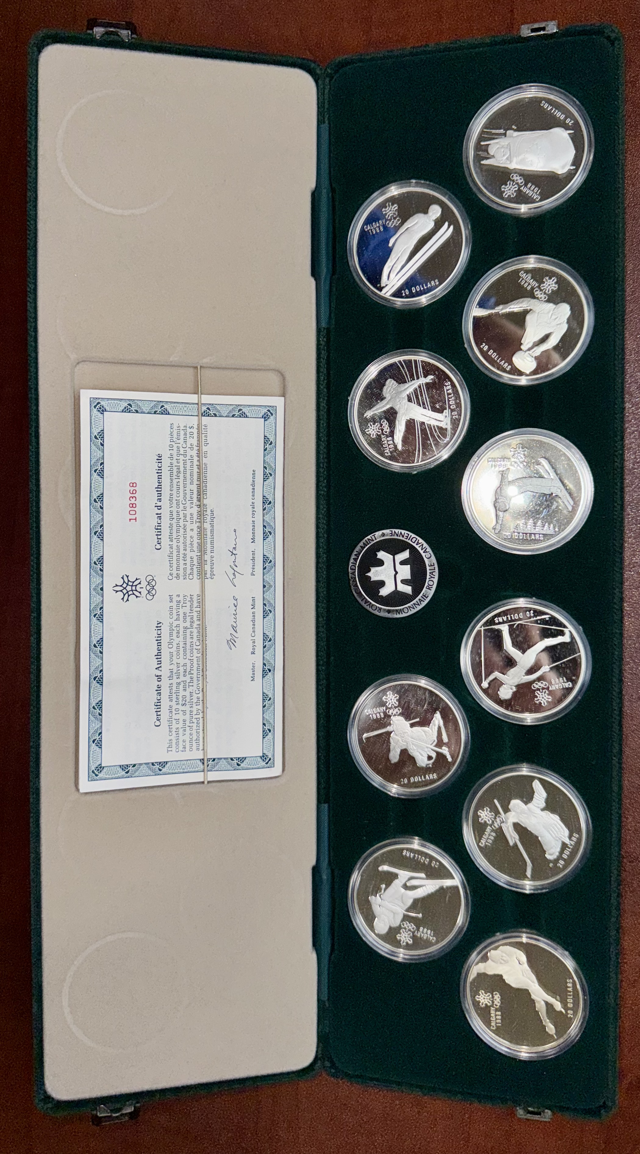 The Royal Canadian Mint released a prestigious 10-coin silver proof set to commemorate and finance the 1988 Calgary Winter Olympic Games. Produced between 1985 and 1987, each coin in the series holds a face value of $20 CAD and contains one troy ounce of actual silver weight, struck in .925 sterling silver. Notably, this set introduced edge lettering to Canadian silver coinage for the first time, featuring the inscription “XV OLYMPIC WINTER GAMES - JEUX OLYMPIQUES D’HIVER.” These coins are typically housed in a signature green felt or leatherette display case and accompanied by a certificate of authenticity.
