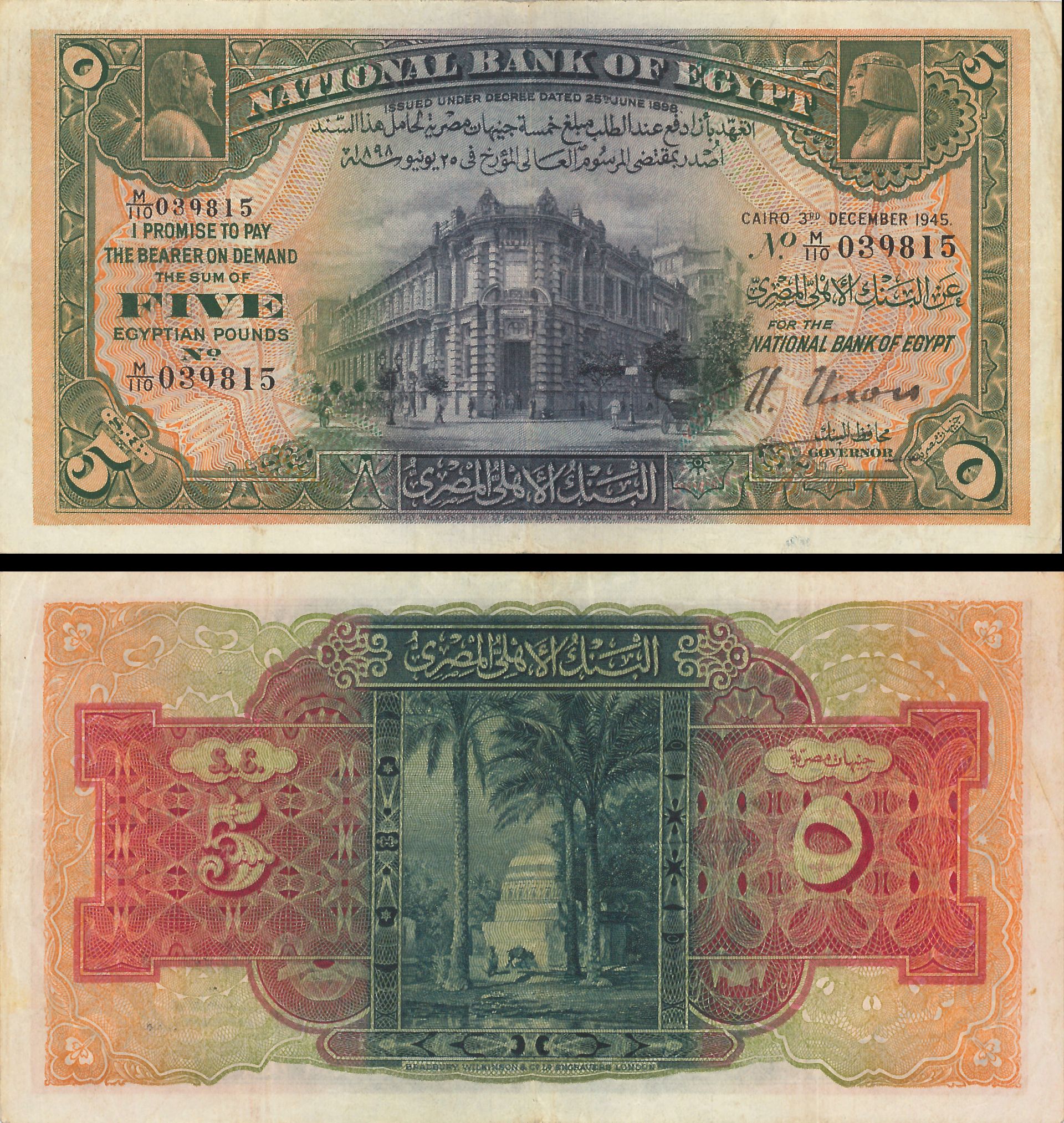 Egypt - Five Egyptian Pounds - P-19c - 1945 dated Foreign Paper Money