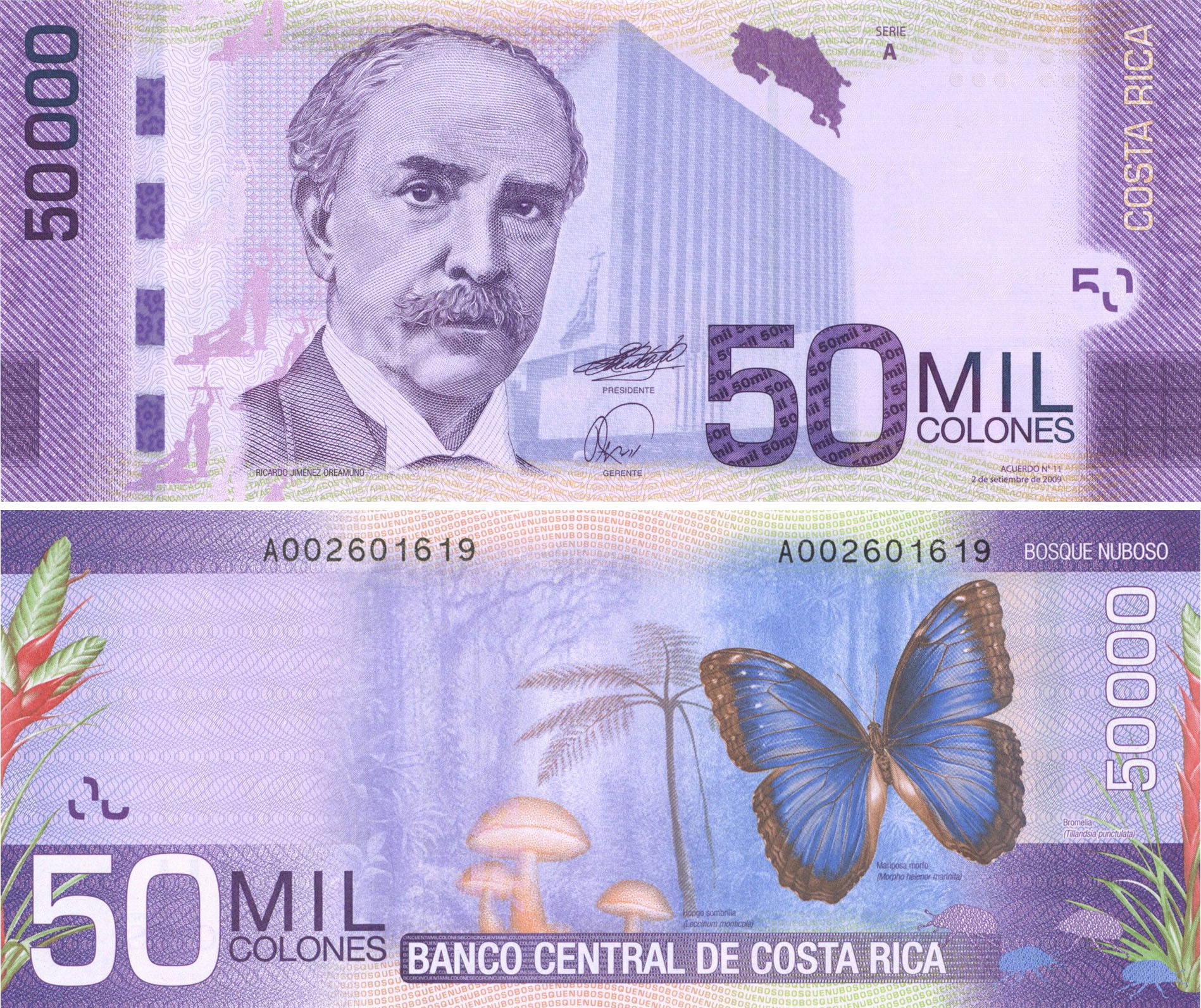 50,000 Colones, P-279. Great purple coloring with butterfly and security strip on back! The colón (code: CRC) is the currency of Costa Rica. It was named after Christopher Columbus, known as Cristóbal Colón in Spanish. The colón sign is not to be confused with U+00A2 ¢ CENT SIGN (HTML ¢ · ¢), or with the Ghanaian cedi, U+20B5 CEDI SIGN. Nonetheless, the commonly available cent symbol '¢' is frequently used locally to designate the colón in price markings and advertisements. The colón was introduced in 1896, replacing the Costa Rican peso at par. The colón is divided into 100 centimos, although, between 1917 and 1919, coins were issued using the name centavo for the 1/100 subunit of the colón. Colóns were issued by a variety of banks in the first half of the twentieth century, but since 1951 have been produced solely by the Central Bank of Costa Rica. The currency was subject to a crawling peg against the United States dollar from 2006 to 2015, but has been floating since then. Read more at https://en.wikipedia.org/wiki/Col%C3%B3n_(currency)