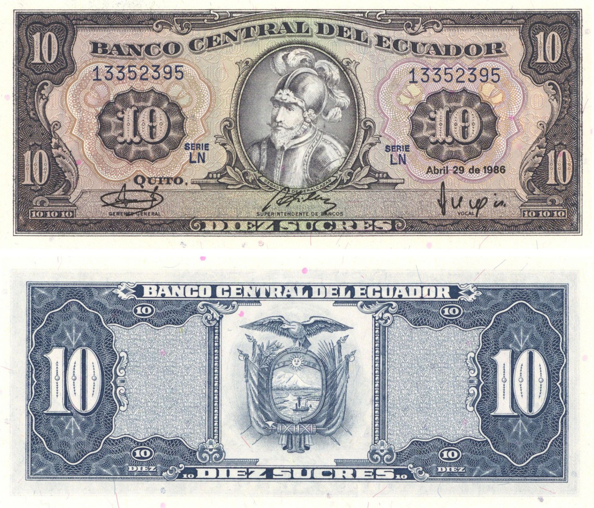 10 Sucres, P-121. The Sucre, Ecuador’s currency from 1884 to 2000, had an ISO code of ECS. It was subdivided into 10 decimos and 100 centavos. Named after Latin American political leader Antonio José de Sucre, the Sucre was replaced by the US dollar due to the 1998-99 financial crisis. On March 22, 1884, the Ecuadorian peso was renamed Sucre and linked to the silver standard. Initially, the Sucre was tied to 22.5 grams of fine silver (equivalent to 5 LMU francs). Outdated coins were phased out between 1887 and 1892, leaving only the silver-backed coins in circulation.