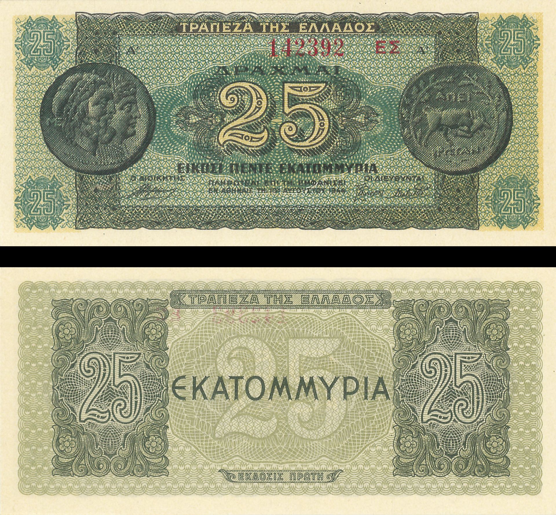 Greece - 25,000,000 Greek Drachmai - P-130b - 1944 dated Foreign Paper Money