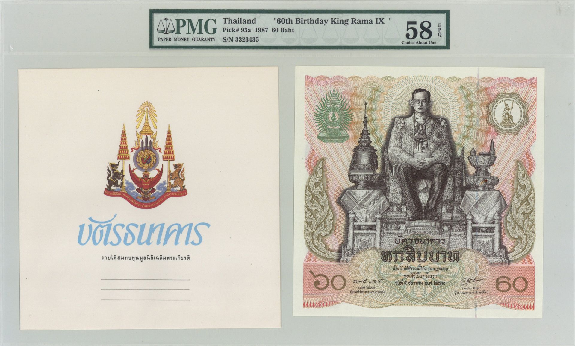 Inv# FM1196A Foreign Paper Money Cat# P-93aPMG Graded 58 Choice About Unc. P-93a, 60 Baht. Rama IX seated on throne at ctr/Victory crown at left/Royal regalia at right/Royal family seated w/ subjects . Scarce colorful original envelope.