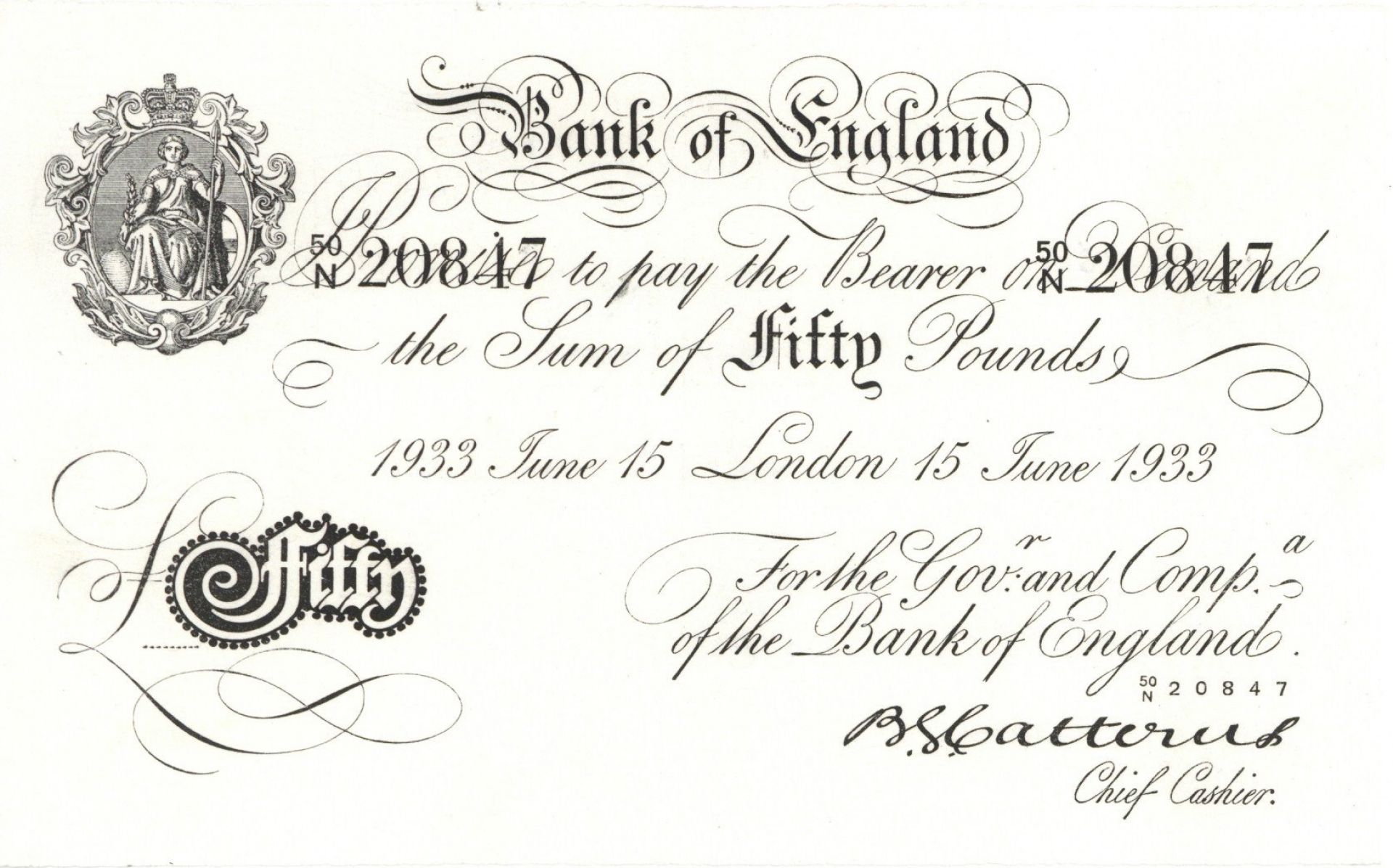 Great Britain - Operation Bernhard Note £50 - P-331 - June 15, 1933 dated Foreign Paper Money - Famous Counterfeit Note