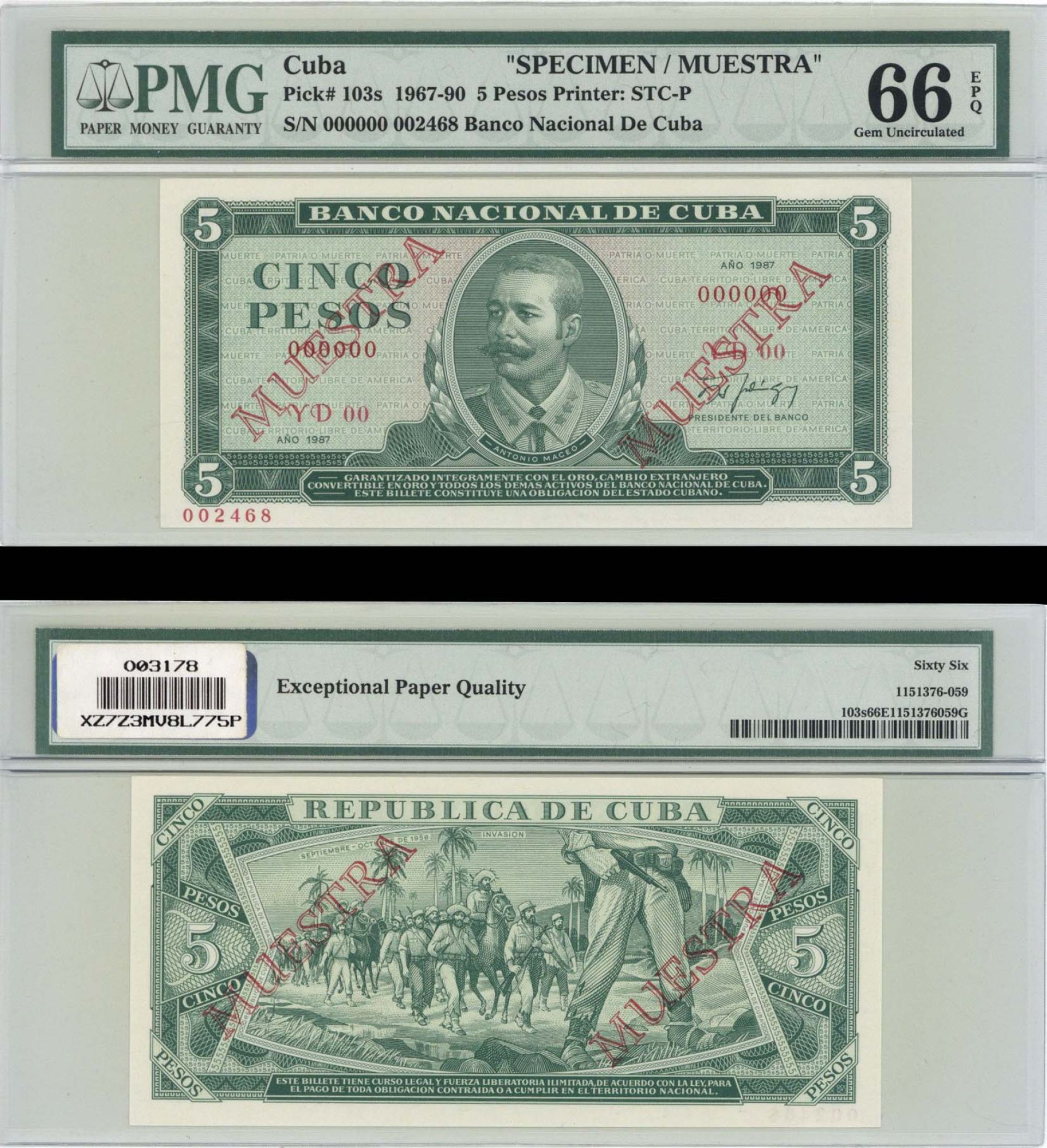Cuba PMG Grade 66 Specimen - 5 Pesos - P-103s - 1967-90 dated Foreign Paper Money
