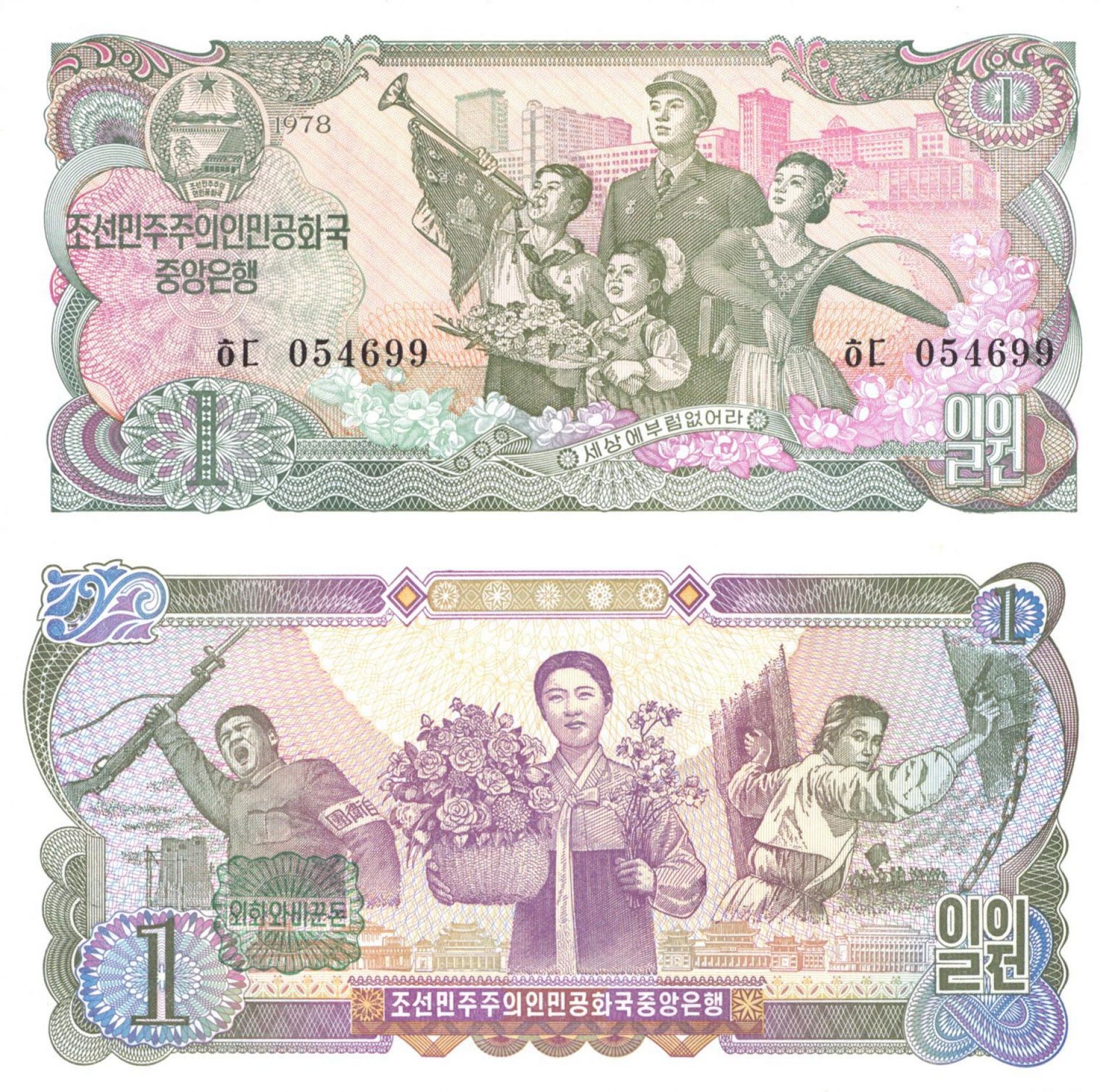 Foreign Paper Money. 2 Adults, 2 Children, soldier, woman with flowers/Woman. Pick-18b. The Korean People's won, sometimes known as the North Korean won or Democratic People's Republic of Korea won, is the official currency of North Korea. It is subdivided into 100 chon. The currency is issued by the Central Bank of the Democratic People's Republic of Korea, based in the North Korean capital city of Pyongyang.