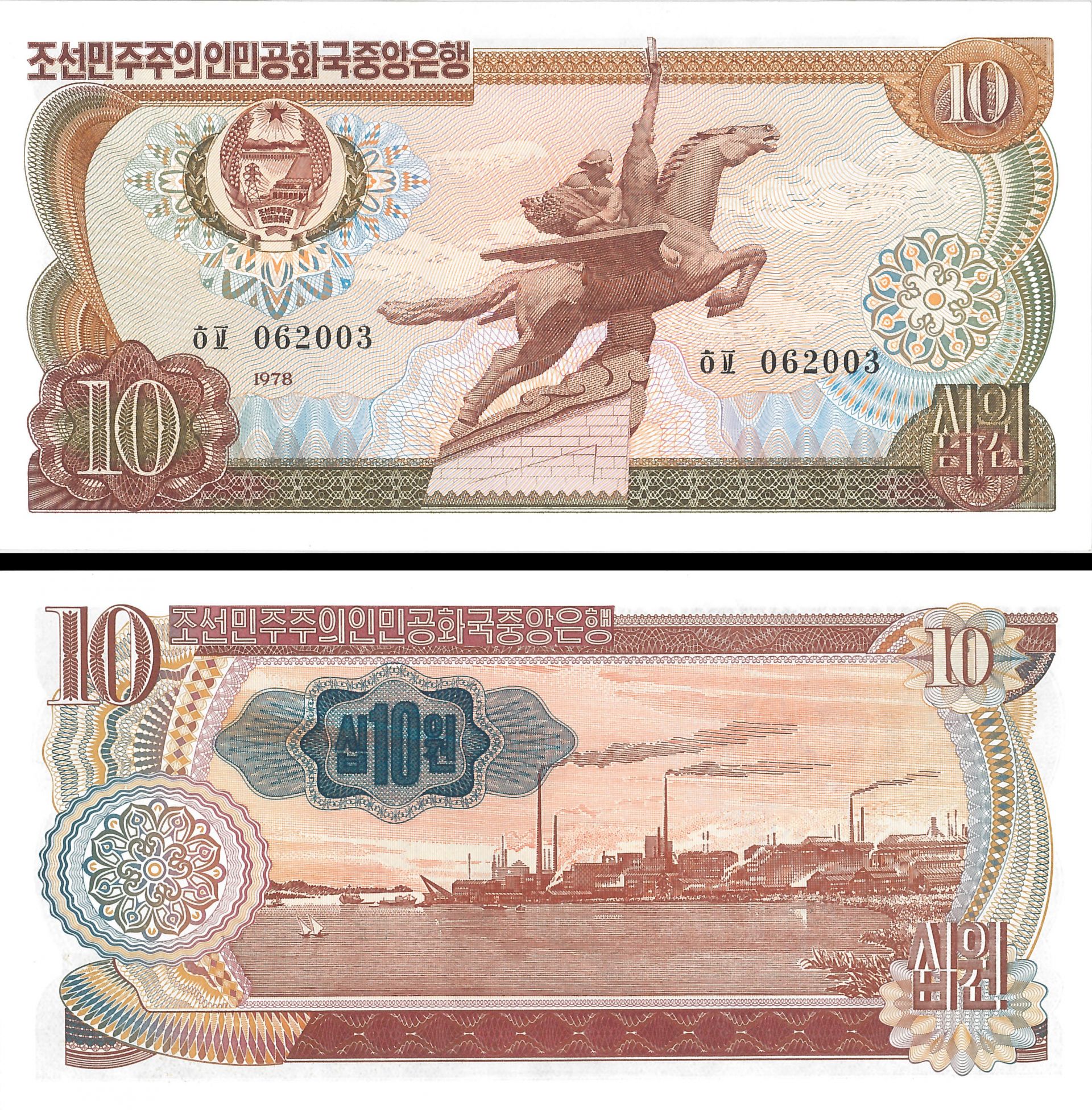 Foreign Paper Money. Winged equestrian statue, Chanlima /Waterfront factory and blue seal. The Korean People's won, sometimes known as the North Korean won or Democratic People's Republic of Korea won, is the official currency of North Korea. It is subdivided into 100 chon. The currency is issued by the Central Bank of the Democratic People's Republic of Korea, based in the North Korean capital city of Pyongyang. Won is a cognate of the Chinese yuan and Japanese yen. All three names derive from the Hanja, which means "round shape". The won is subdivided into 100 chon. Read more at https://en.wikipedia.org/wiki/North_Korean_won