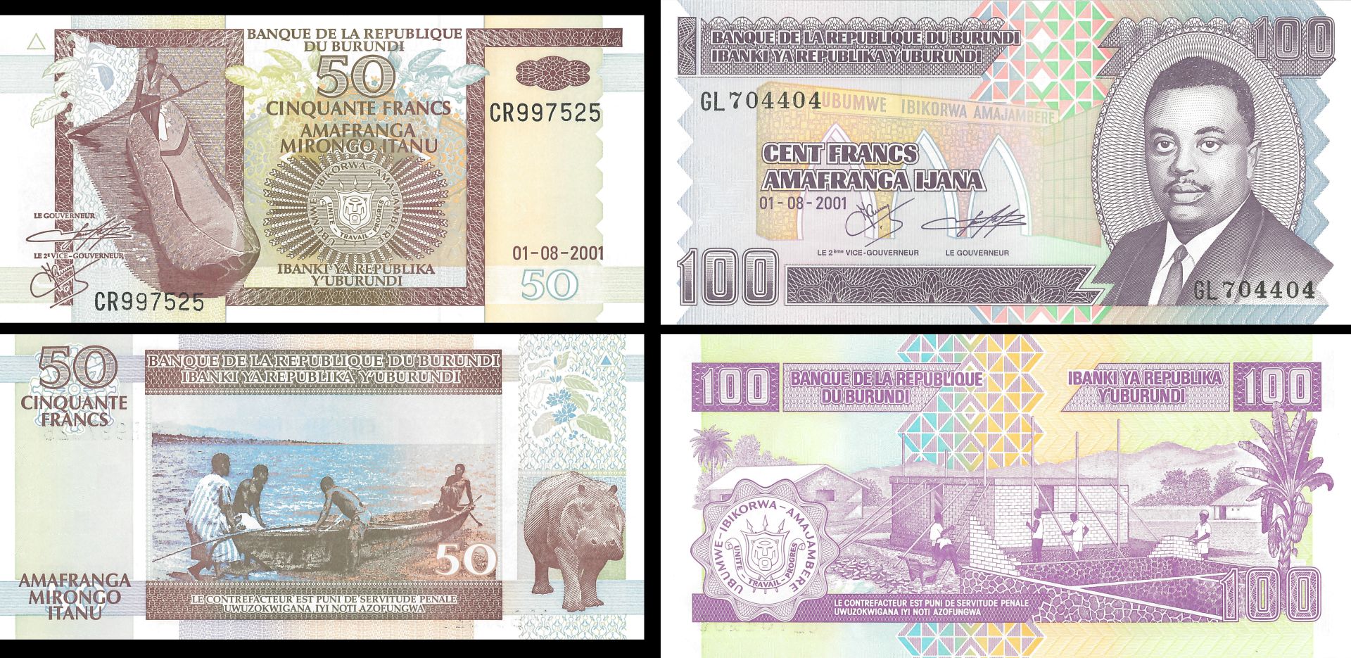 Burundi - 500 & 100 Francs - P-36 and P-37 - Pair of Notes - 2001 dated Foreign Paper Money