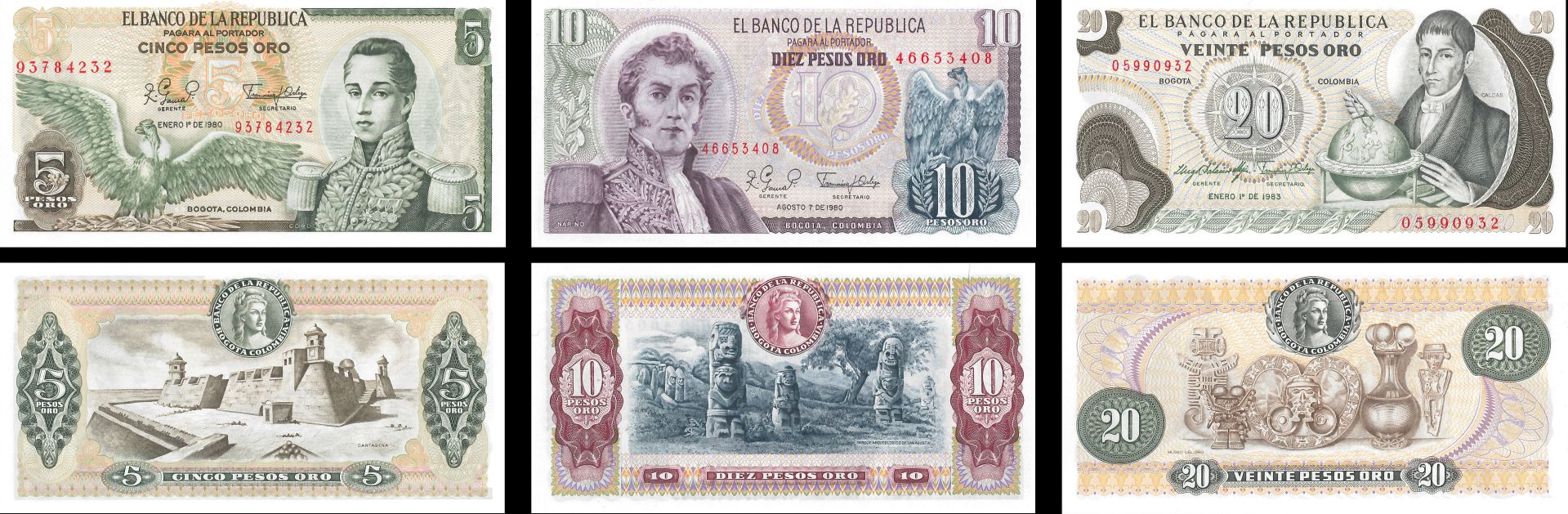 Colombia - 5, 10, 20 Pesos Oro - P-406f, 407g, 409d - 1980-1990 dated Foreign Paper Money