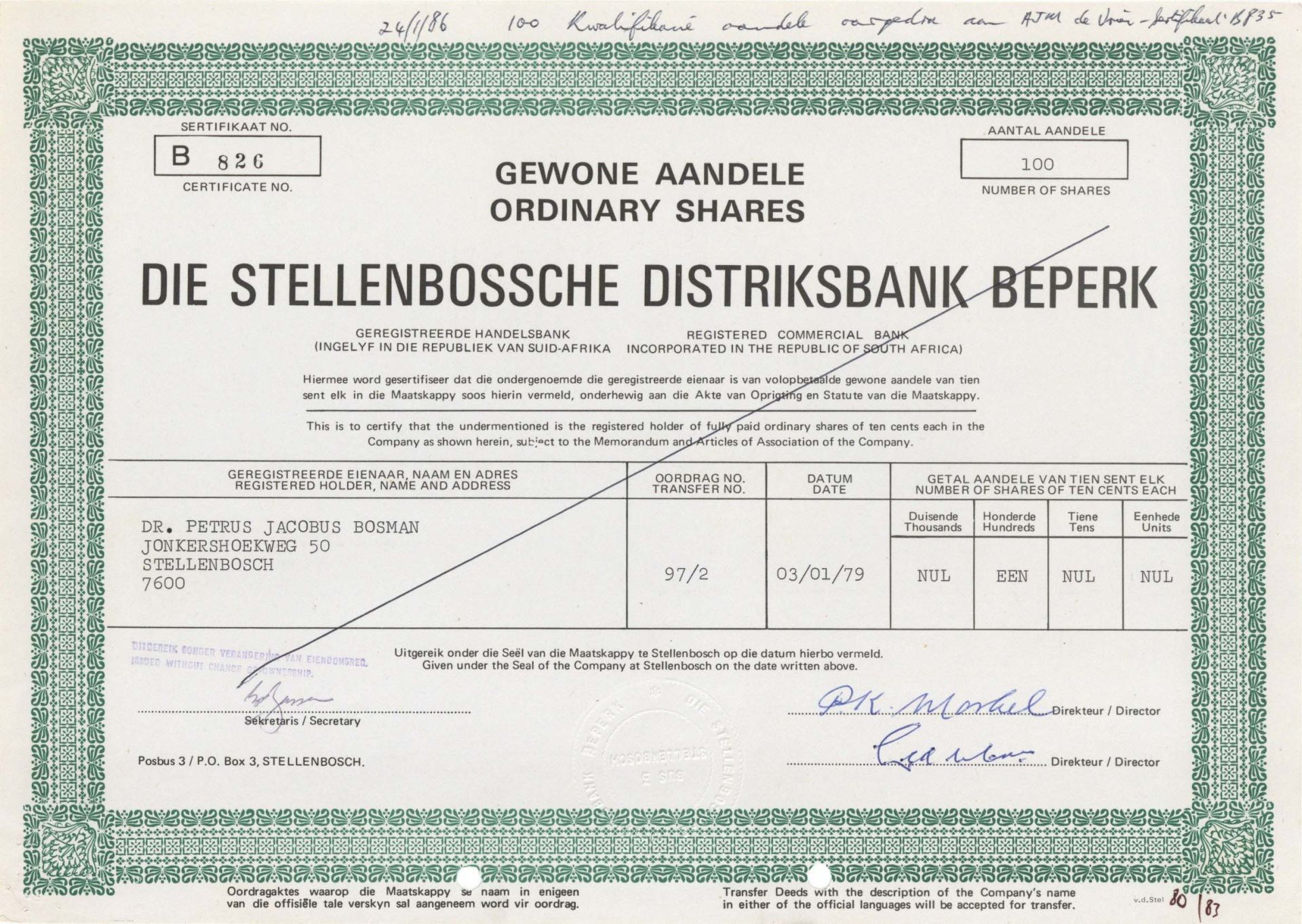 Die Stellenbossche Distriksbank Beperk - 1979 dated Stock Certificate