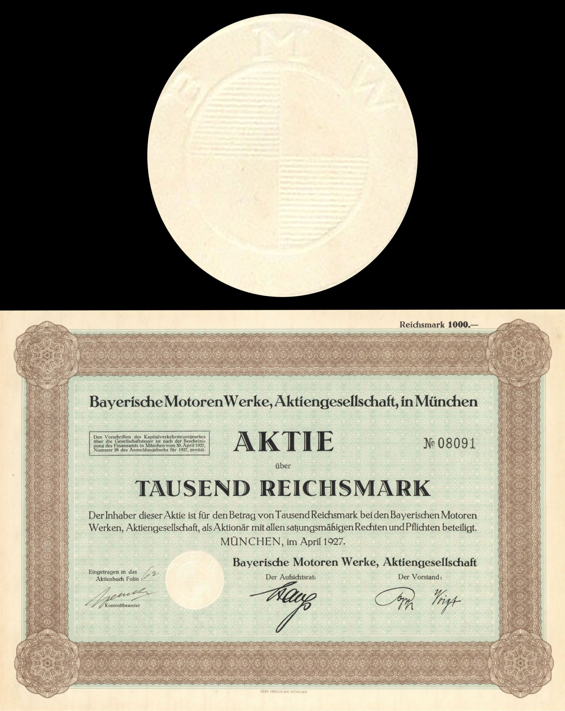 Stock printed by Gebr. Parcus, Munchen. “BMW" Germany. 1927 Uncanceled 1,000 Reichsmark.