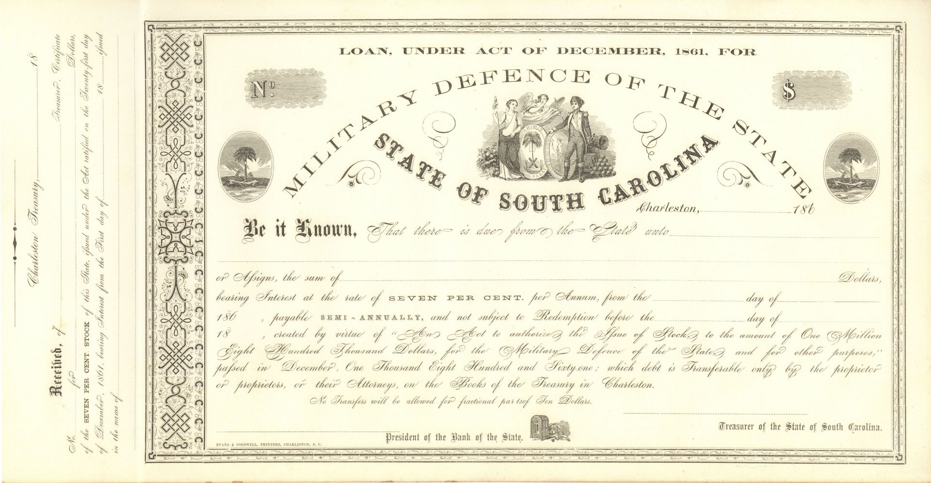 Military Defence of the State of South Carolina - 1860's dated Unissued Defence Bond - Charleston, South Carolina