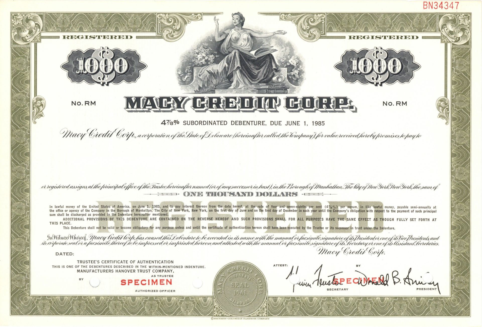 $1,000 4 7/8% Specimen Bond printed by Security-Columbian Banknote Company. Macy Credit Corporation is a wholly-owned consumer credit subsidiary of R.H. Macy Corporation. The Company purchases and finances customer accounts receivable arising under deferred payment plans.