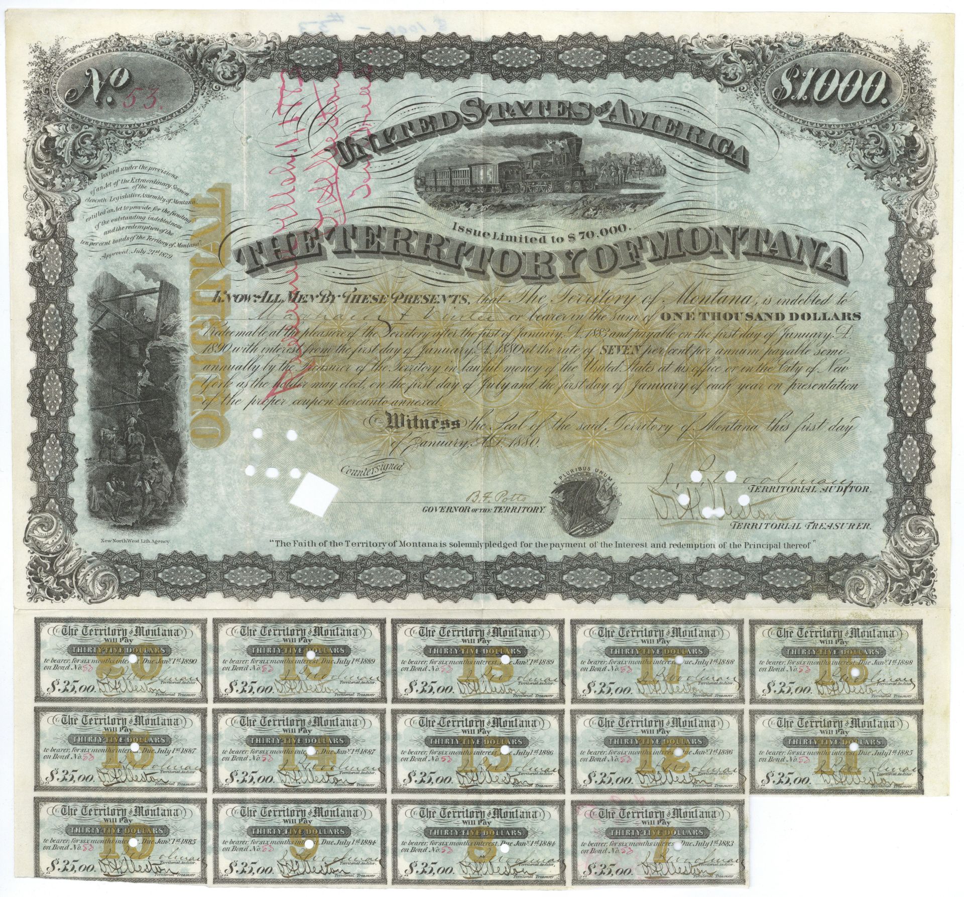 Territory of Montana - Very Rare Gorgeous $1000 Bond with Gold Underprint - Beautiful Bond for a Beautiful State