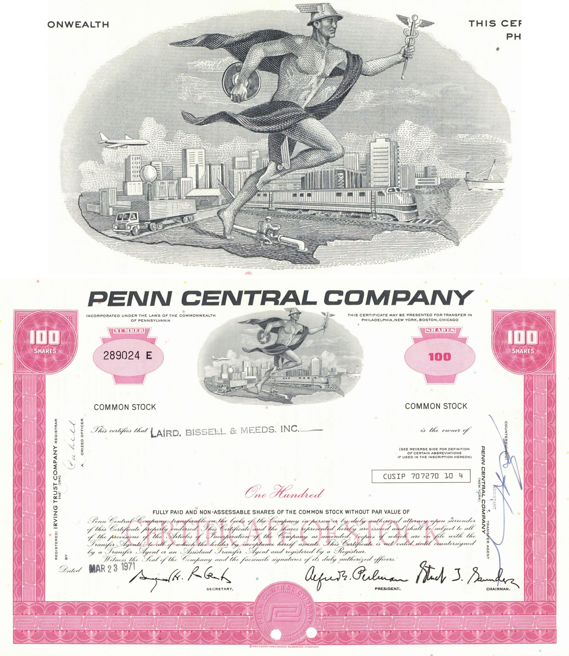 Penn Central Co. - 1970's dated Pennsylvania Railway Stock Certificate - Great Railroad History - Available in Purple, Brown, Blue or Red - Please Specify Color