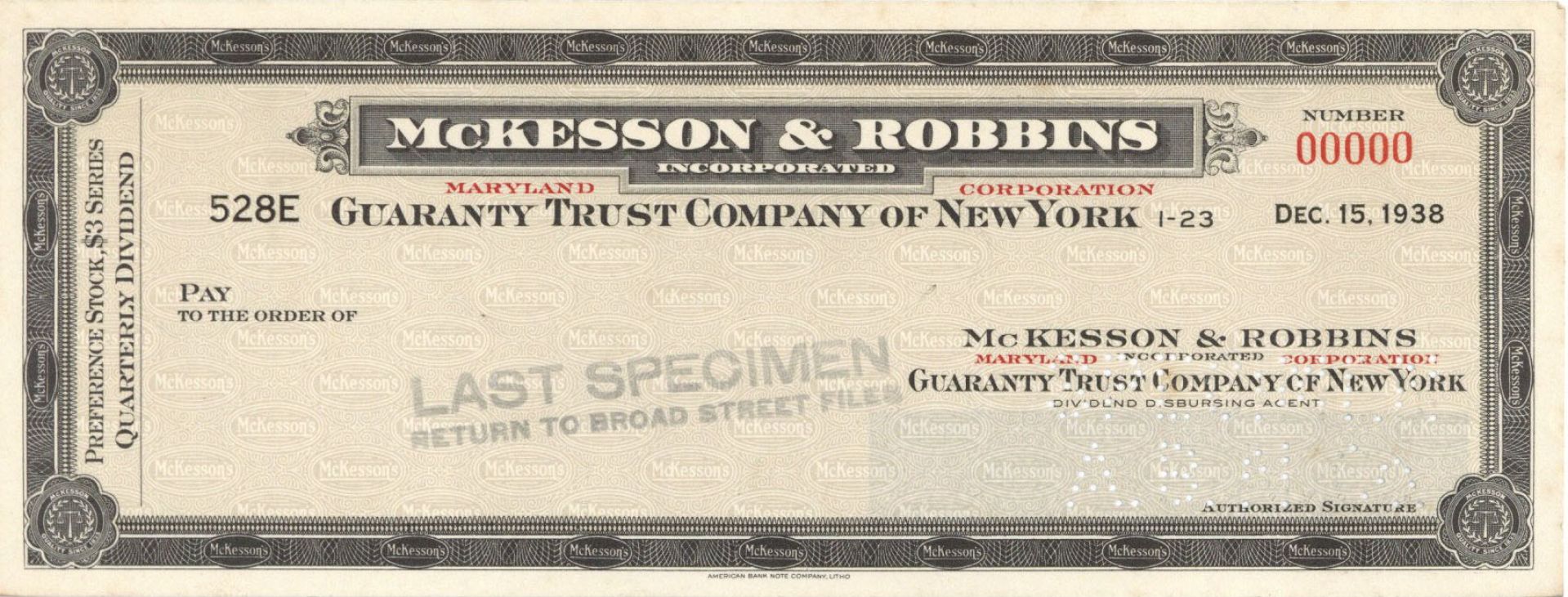 Inv# ABNS1136 Specimen CheckSpecimen Dividend Check printed by American Bank Note Company. Guaranty Trust Company of New York. The McKesson & Robbins, Inc. scandal of 1938 was one of the major financial scandals of the 20th century. The company McKesson & Robbins, Inc. (now McKesson Corporation) had been taken over in 1925 by Phillip Musica, who had previously used Adelphia Pharmaceutical Manufacturing Company as a front for bootlegging operations. Musica, a twice-convicted felon, used assumed names to conceal his true identity in taking control of the two companies: Frank D. Costa at Adelphia Pharmaceutical and F. Donald Coster at McKesson & Robbins. Although he was successful in expanding the company's legitimate business operations, Musica recruited three of his brothers, also working under assumed names, one outside the company and two inside it, to generate bogus sales documentation and to pay commissions to a shell distribution company under their control. Eventually, McKesson & Robbins treasurer Julian Thompson discovered the distribution company was bogus. It was determined that about $20 million (about $335 million in 2017 dollars) of the $87 million in assets on the company's balance sheet were phony.