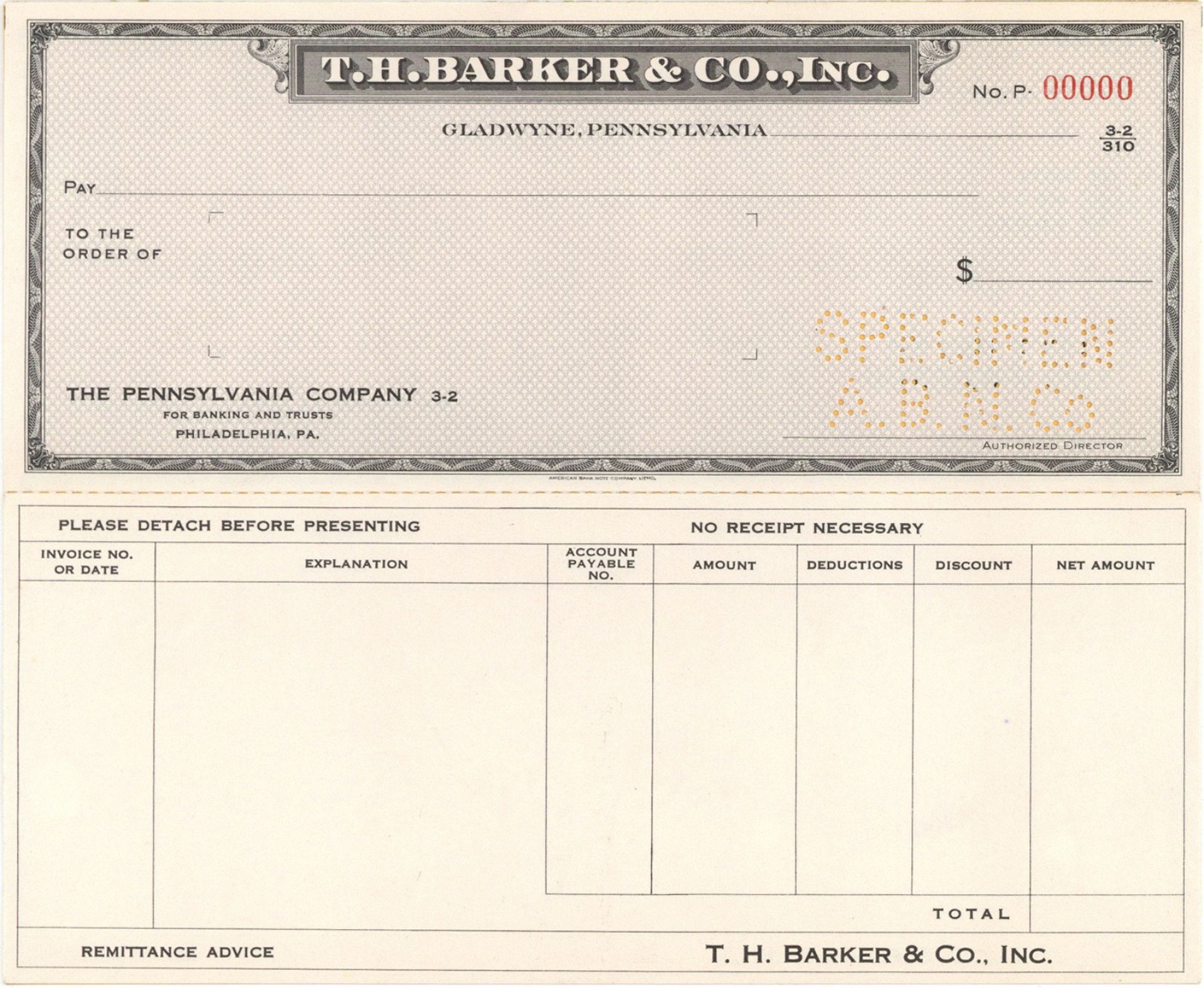 Specimen Check printed by American Bank Note Company. Gladwyne, Pennsylvania. Pennsylvania Company for Banking and Trusts, Philadelphia, PA.