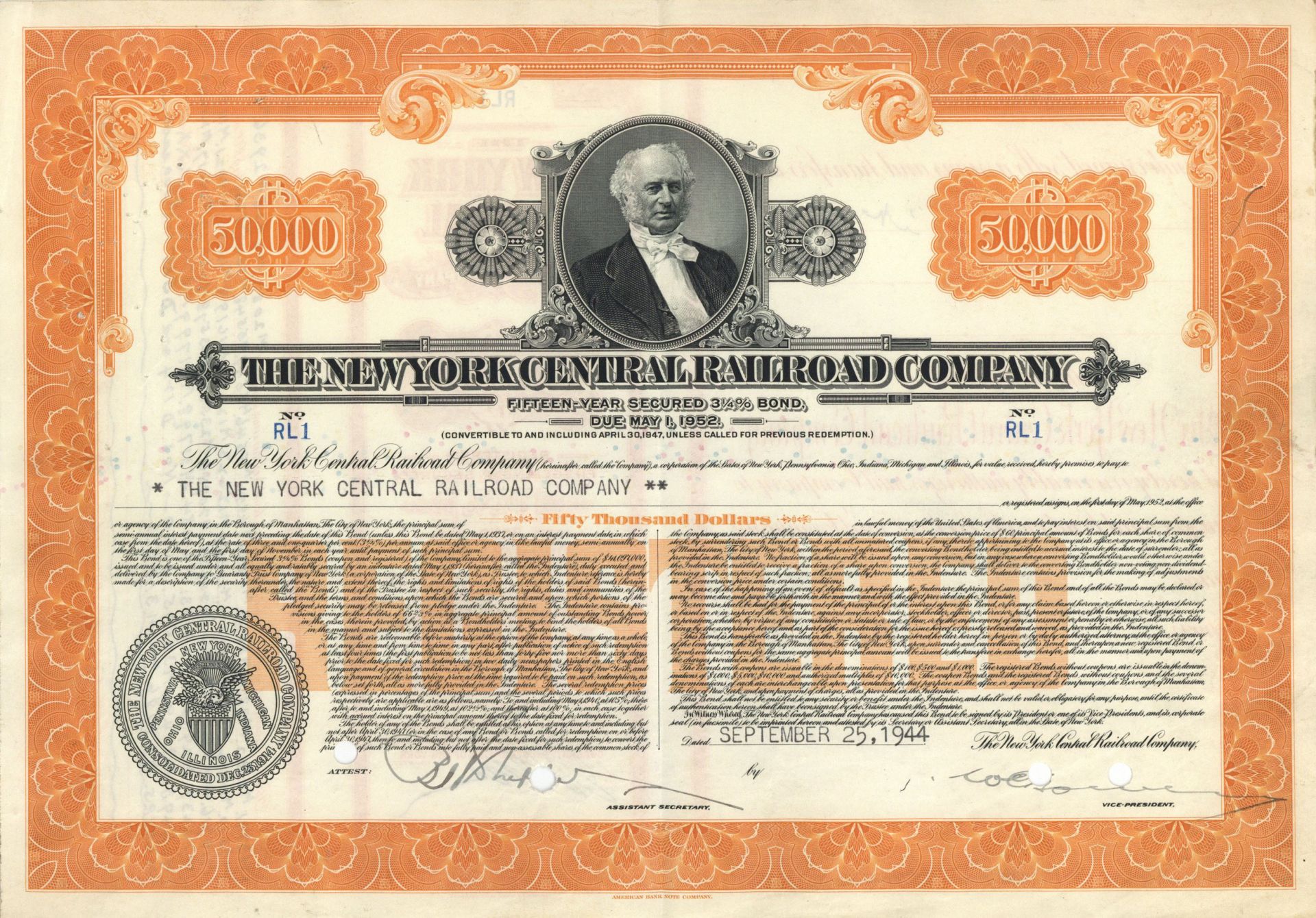 New York Central Railroad Co. - Certificate number RL1 - 1944 dated $50,000 Bond