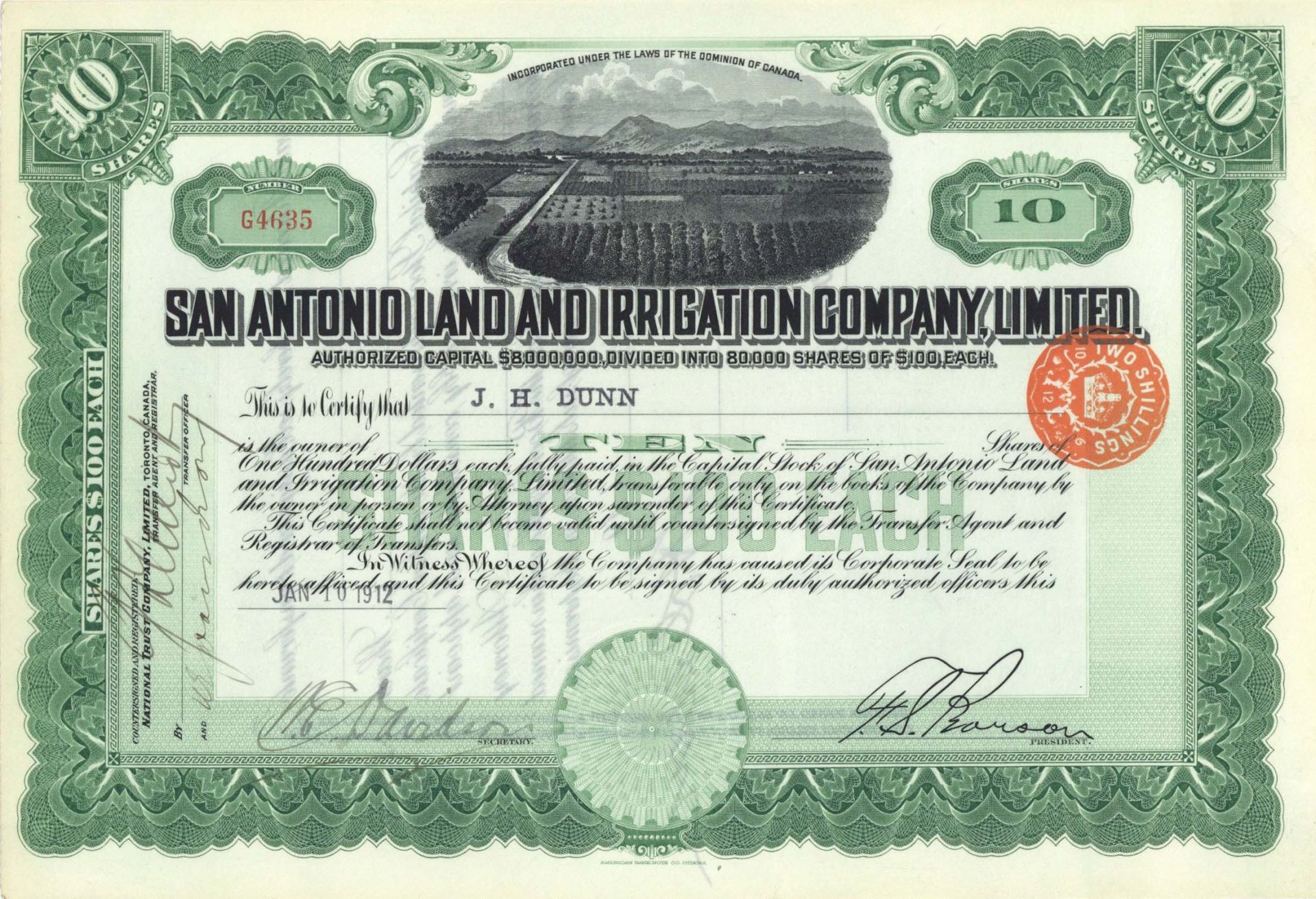 San Antonio Land and Irrigation Co., Limited - 1911 or 1912 dated Stock Certificate