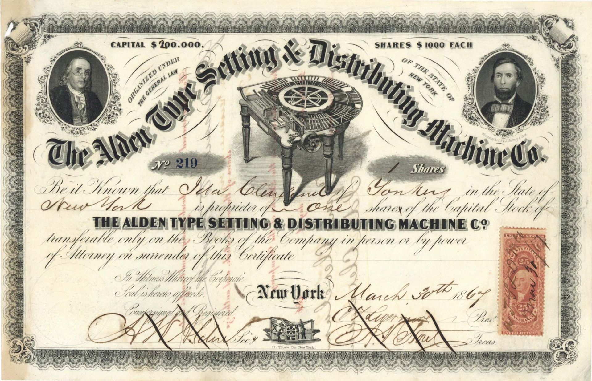 Alden Type Setting and Distributing Machine Co - 1860's-1870's dated Stock Certificate