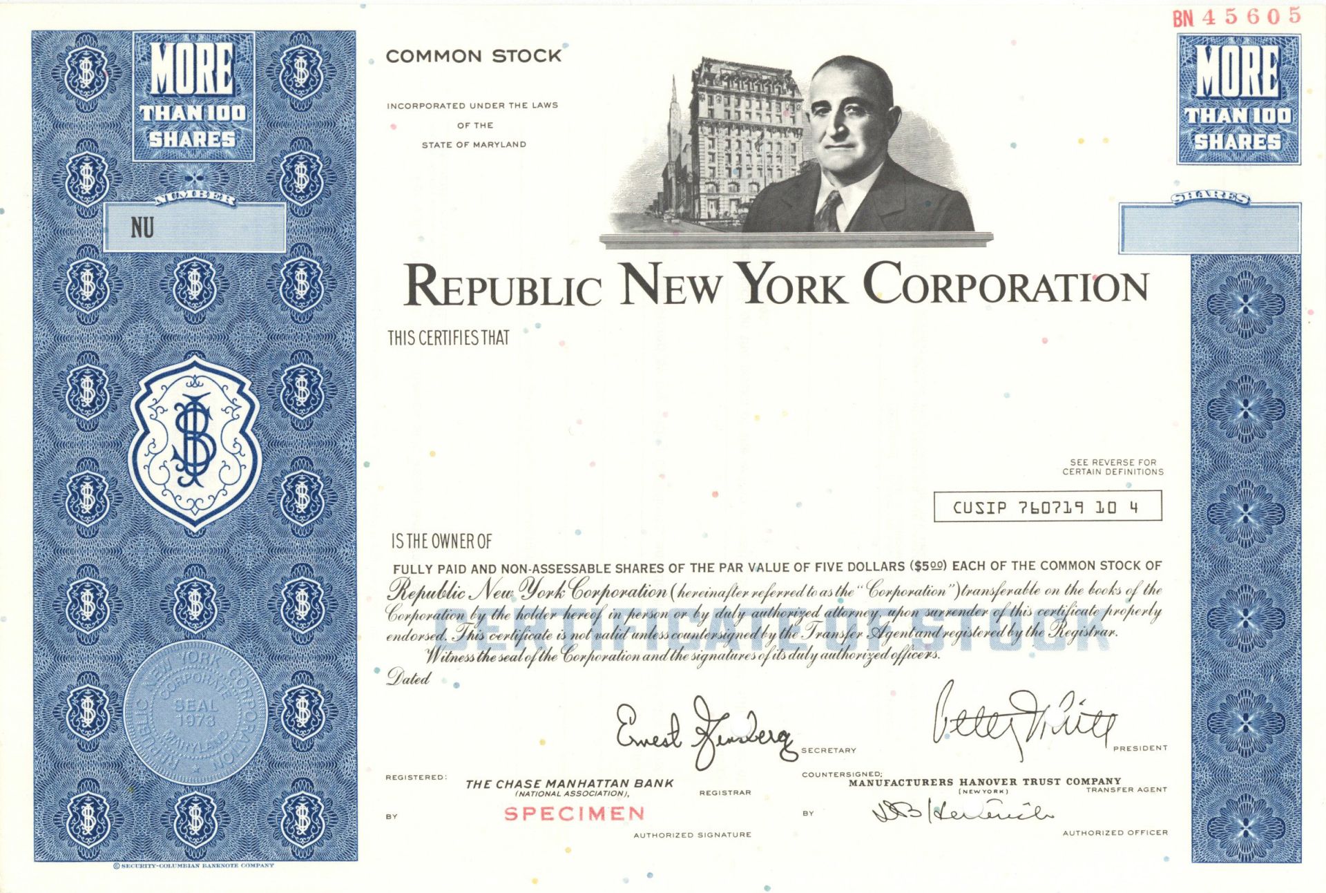 Republic New York Corporation - Vignette of Edmond J. Safra - Specimen Stock Certificate