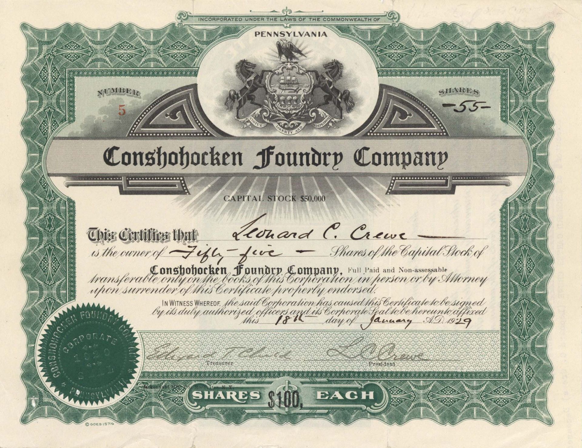 Conshohocken Foundry Co. - 1929 dated Stock Certificate