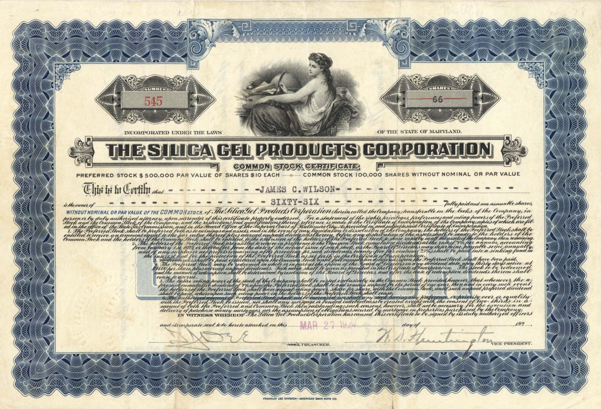 Stock printed by Franklin Lee Division - American Bank Note Co.