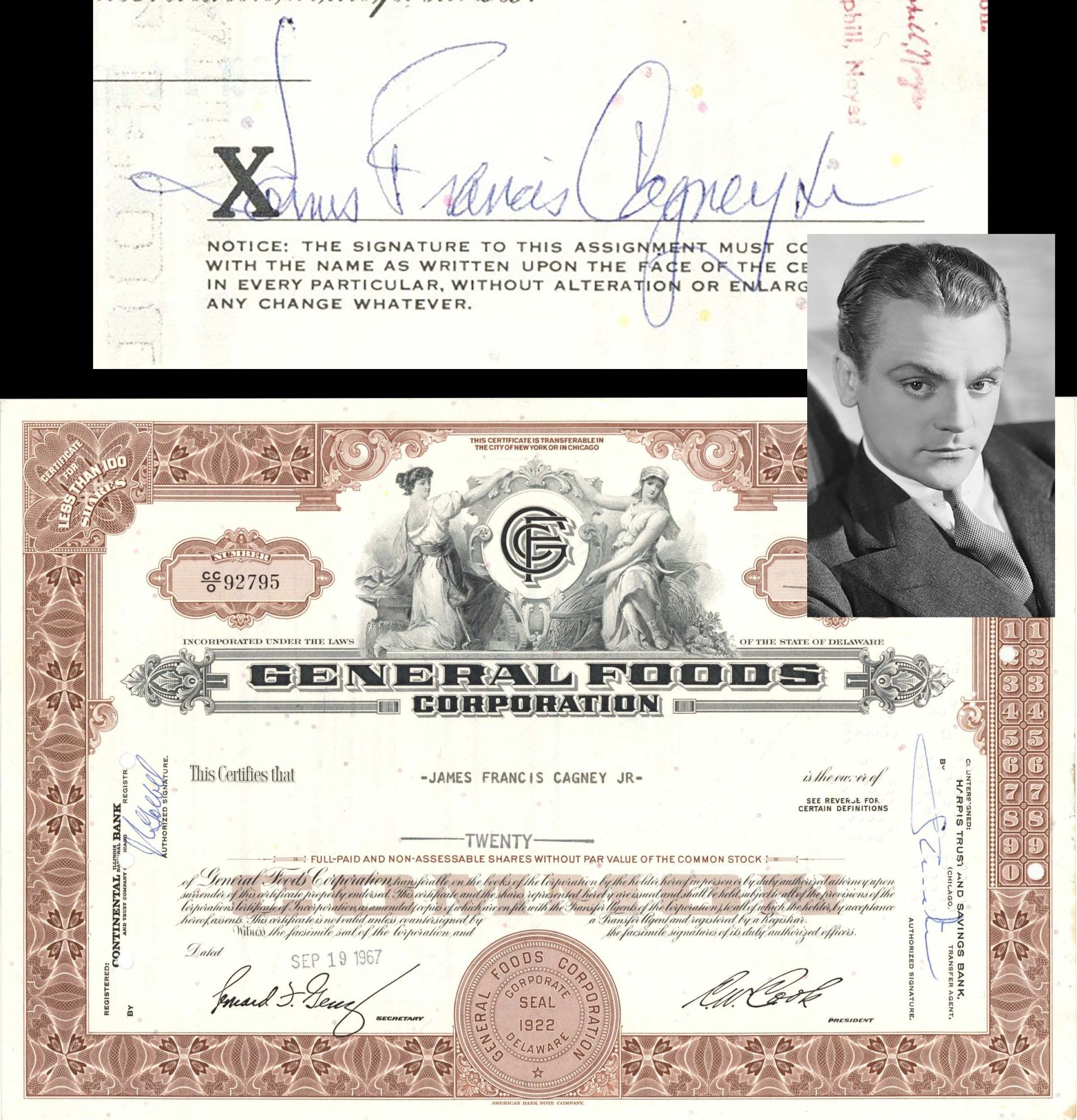 General Foods Corp. issued to and signed by James Francis Cagney Jr. - 1967 dated Stock Certificate