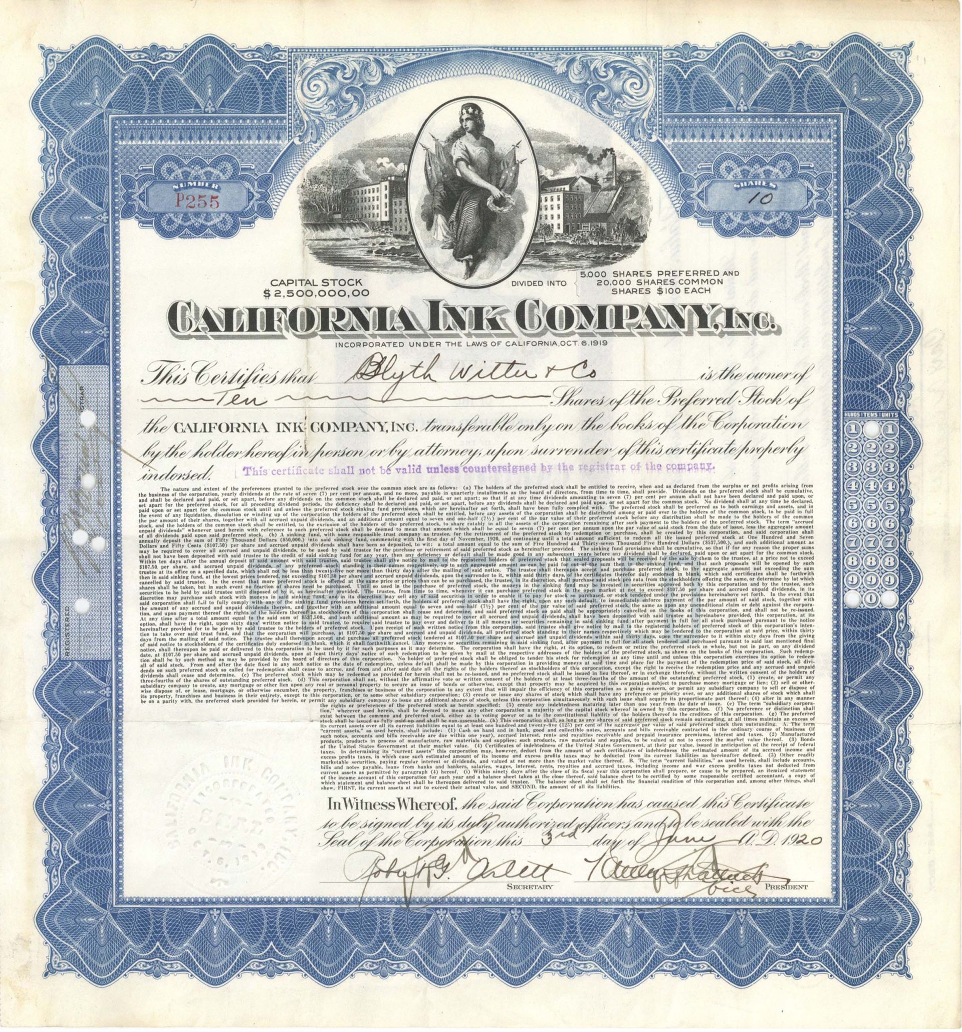 California Ink Company, Inc. - 1919 or 1920 dated Stock Certificate