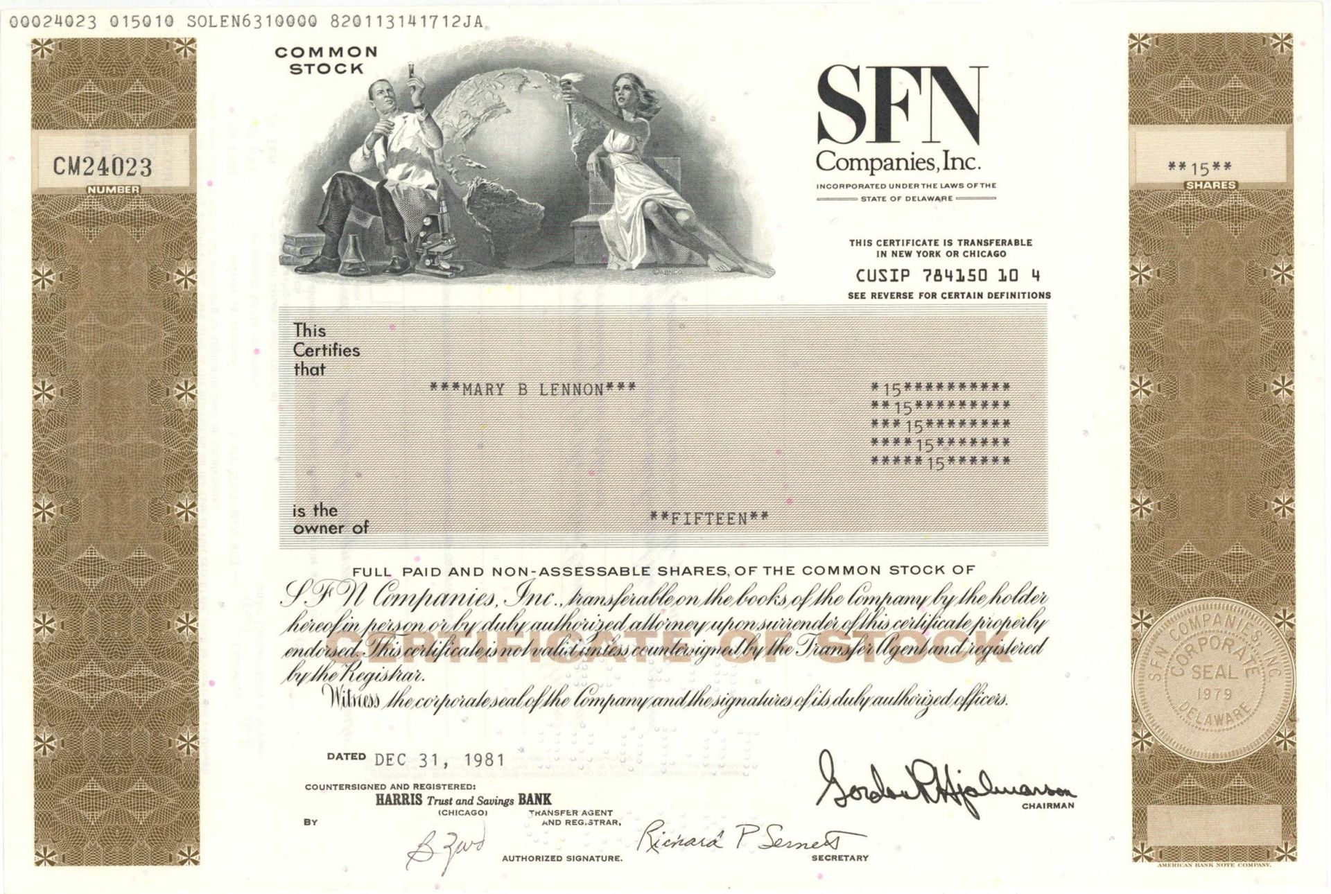 SFN Companies, Inc. - 1981-1984 dated Stock Certificate