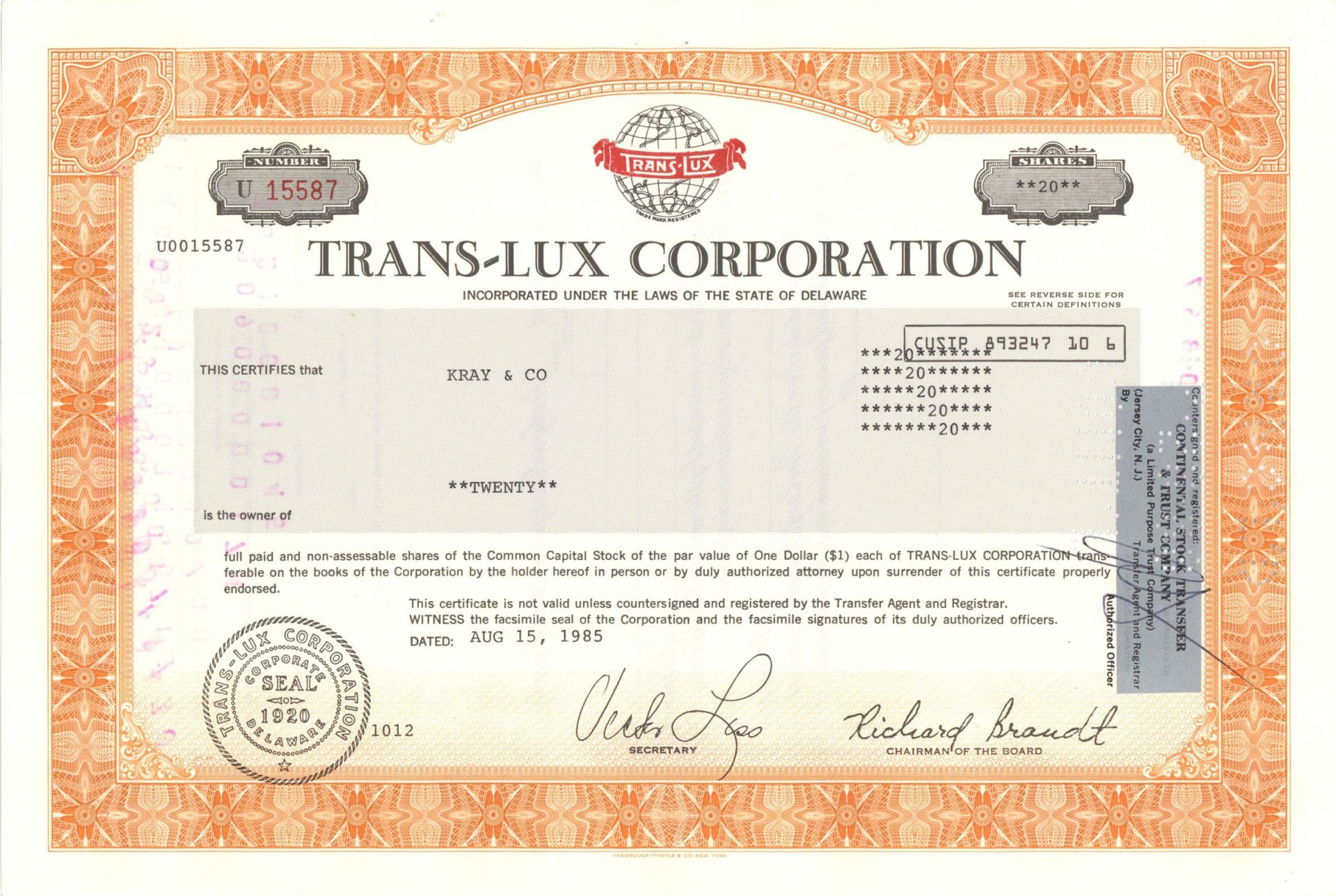 Trans-Lux Corp. - 1985-1988 dated Stock Certificate