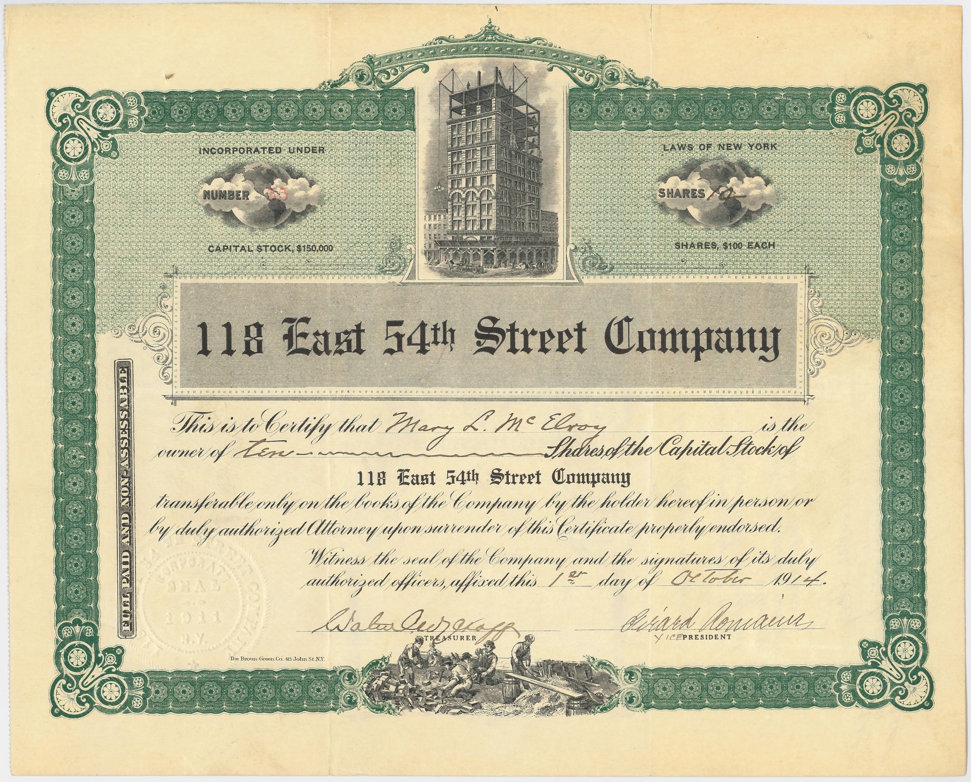 General Stock. Attractive vignettes of skyscraper being built and builders at top and bottom. Rare!!! Available in Green or Brown. Please specify color.