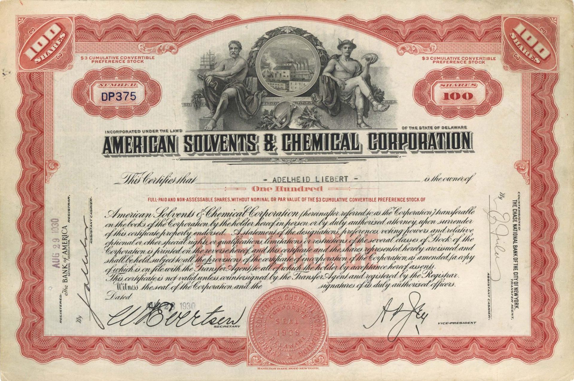 American Solvents and Chemical Corp. - 1930's dated Stock Certificate