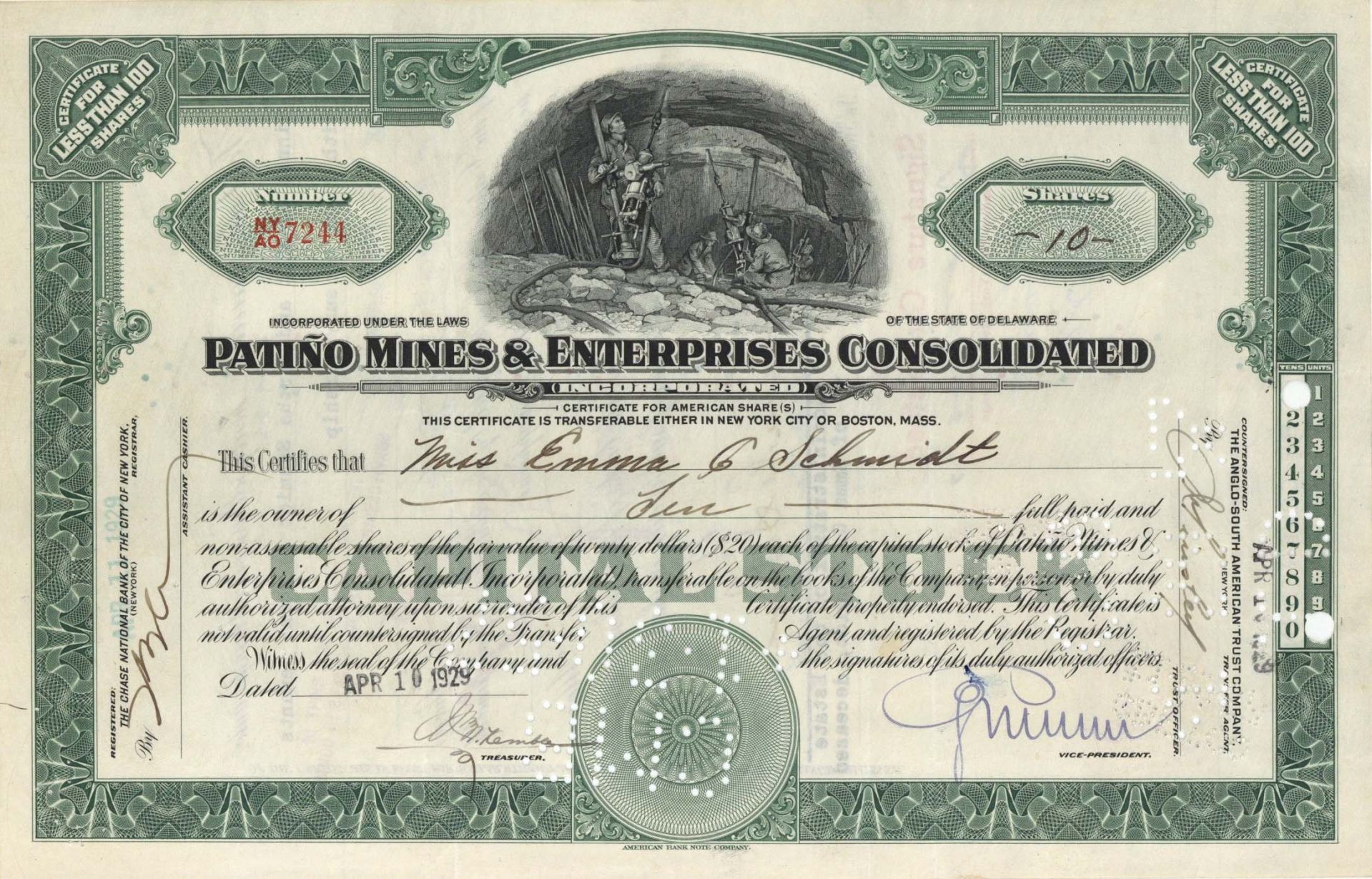 Patino Mines & Enterprises Consolidated Inc. signed by member of Patino Family - 1928-1941 dated Autograph Stock Certificate