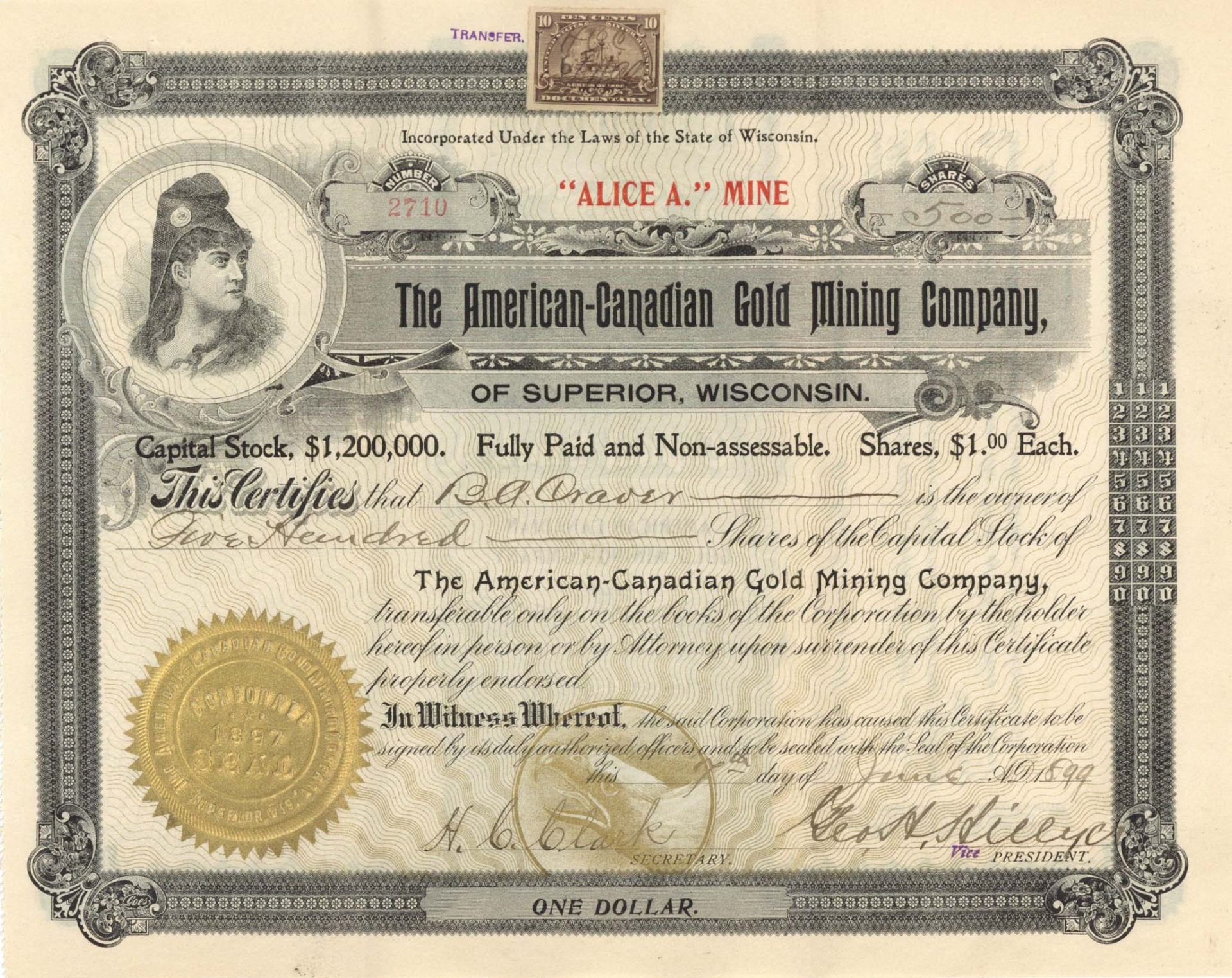 American-Canadian Gold Mining Co., of Superior Wisconsin - 1898 or 1899 dated Stock Certificate