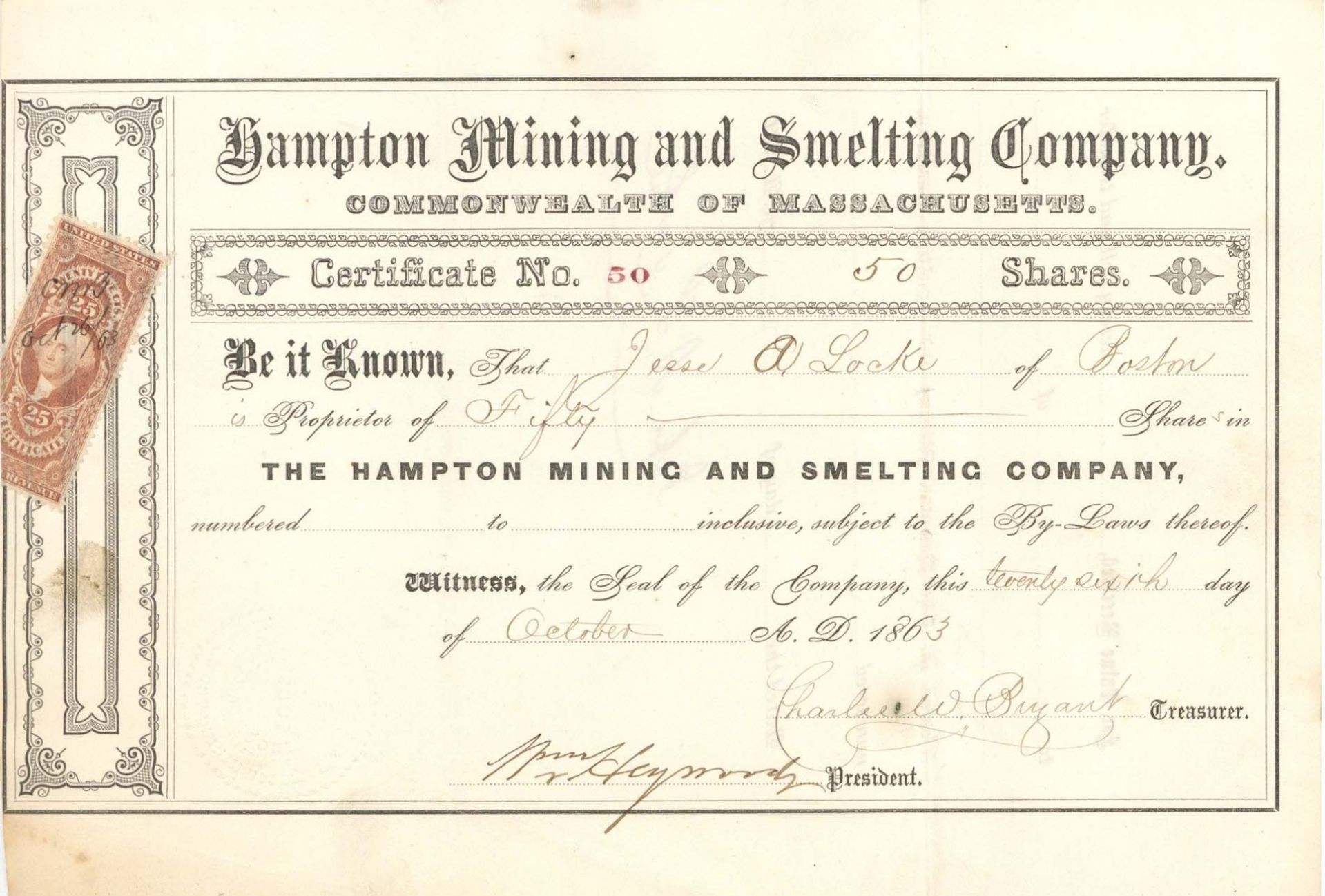 Hampton Mining and Smelting Co. - 1863 or 1865 dated Stock Certificate