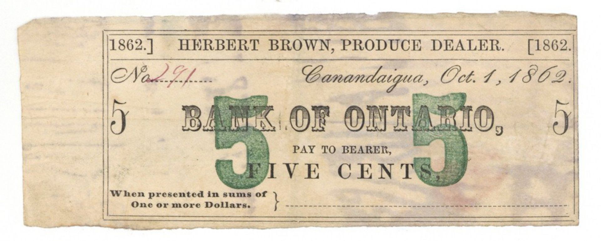 Bank of Ontario - Herbert Brown Produce Dealer 5 Cents Notes - 1862 dated Canadian Obsolete Paper Money