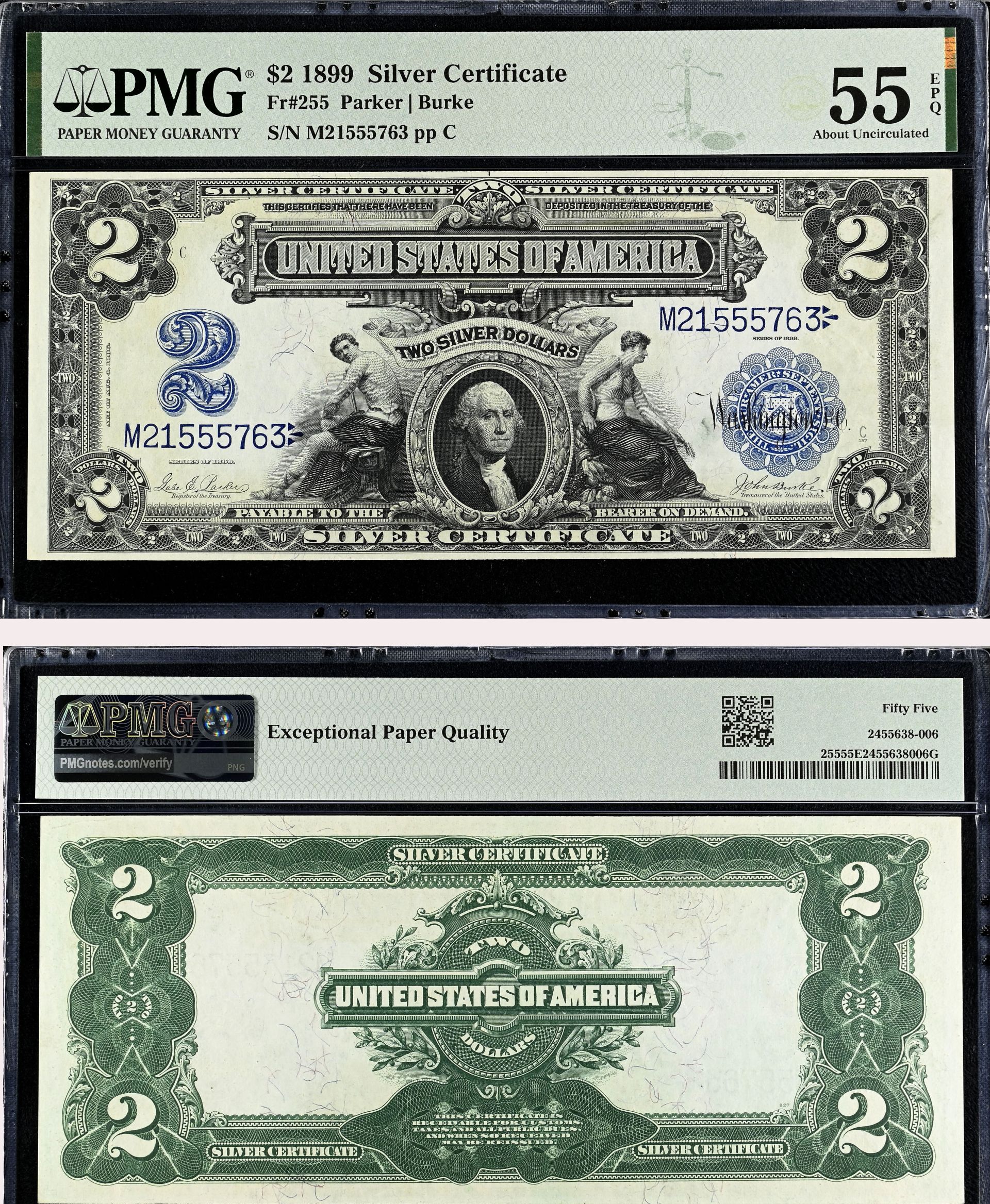 2 Dollars, FR #255, 1899 dated Silver Certificate - PMG Grade 55. SOLD