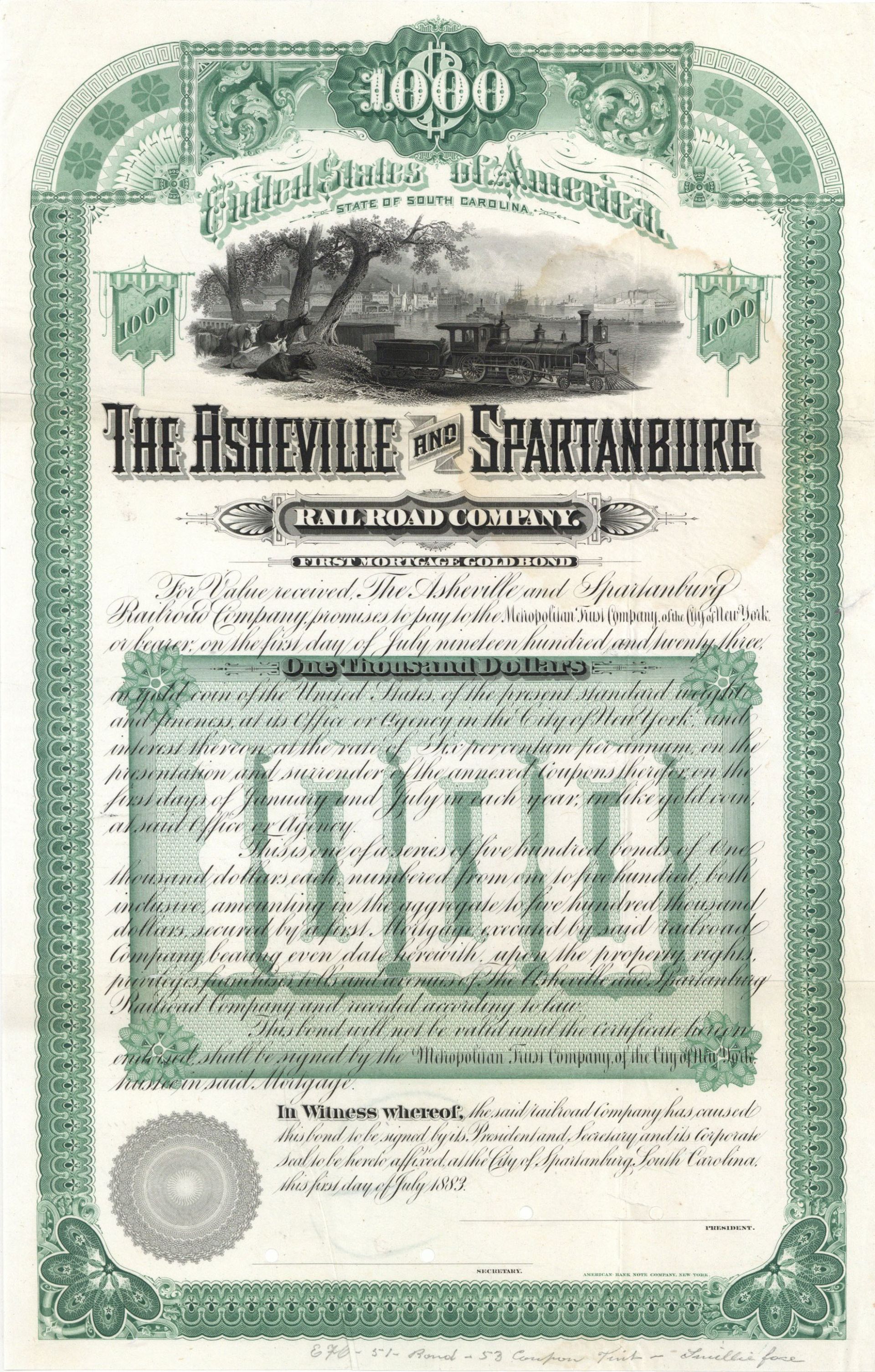 Asheville and Spartanburg Railroad Co. - 1883 dated $1,000 Specimen Bond - Specimen Stocks and Bonds