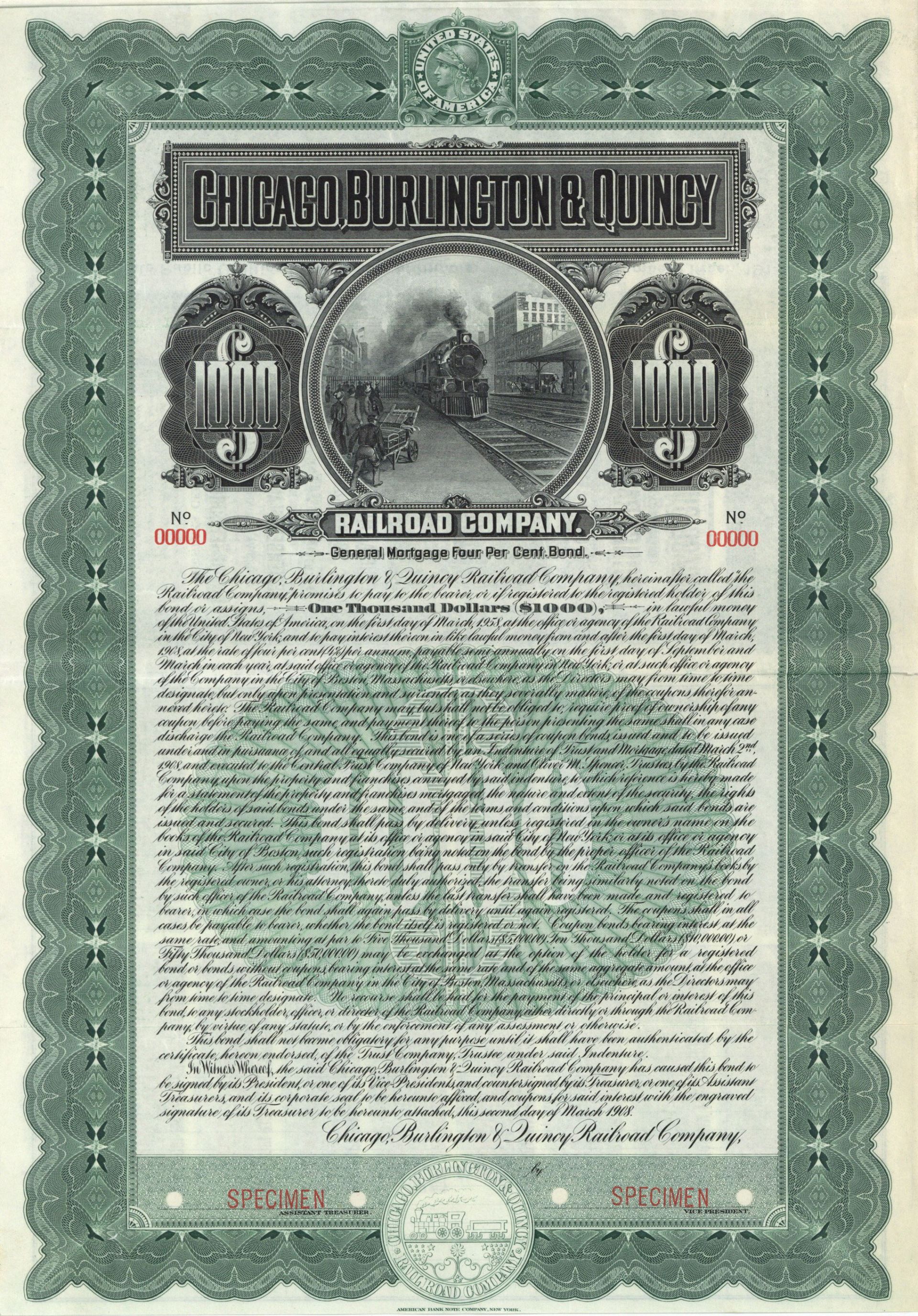 Chicago, Burlington and Quincy Railroad Co. - 1908 dated $1,000 Specimen Bond - Specimen Stocks and Bonds