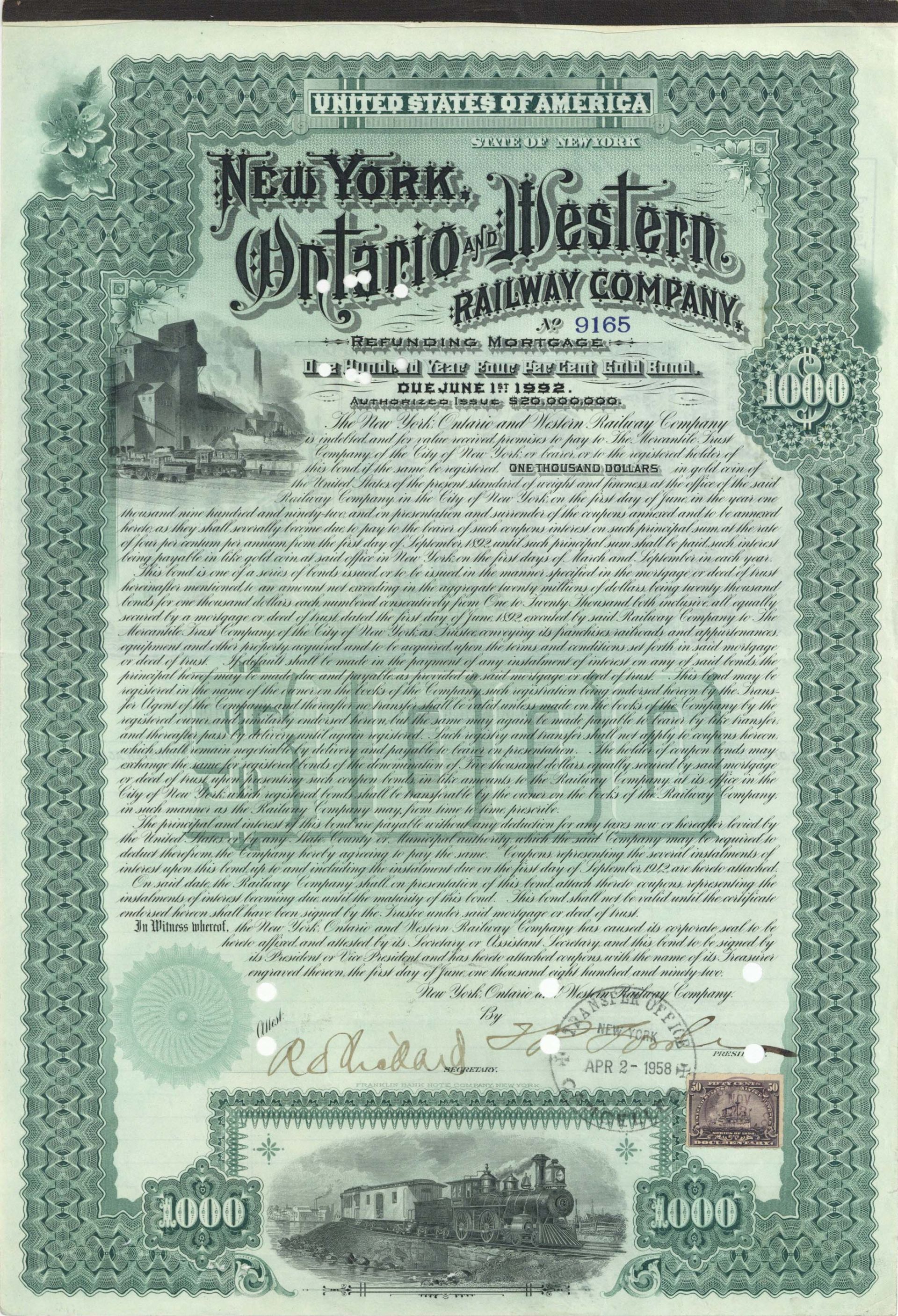 New York, Ontario and Western Railway Co. - 1892 dated $1,000 Bond
