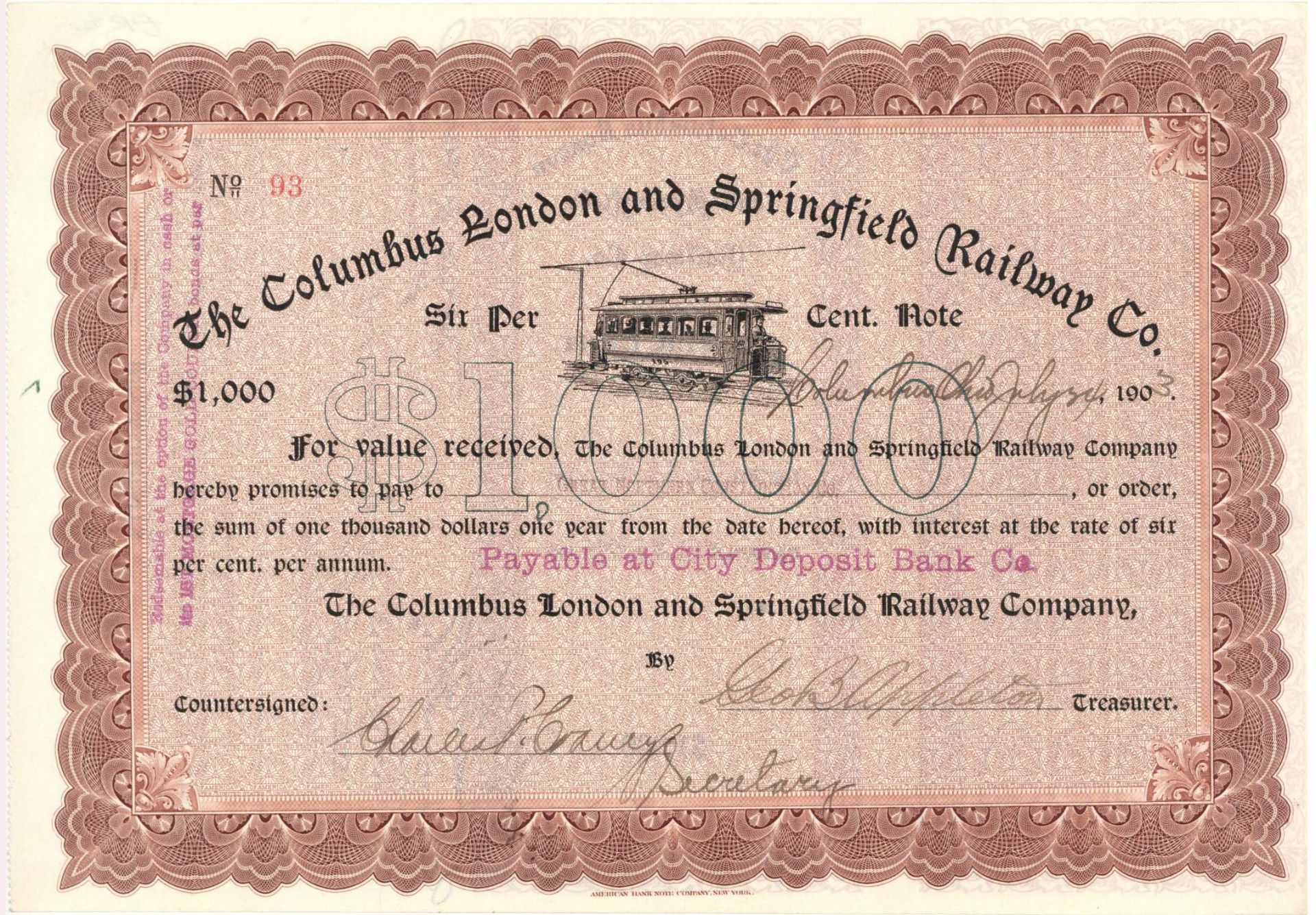 Columbus London and Springfield Railway Co. - 1903 dated $1,000 Bond